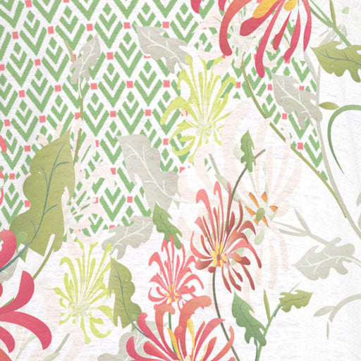 A scattered spring mix of red & coral wildflowers a long side a whimsical pattern of green and coral.