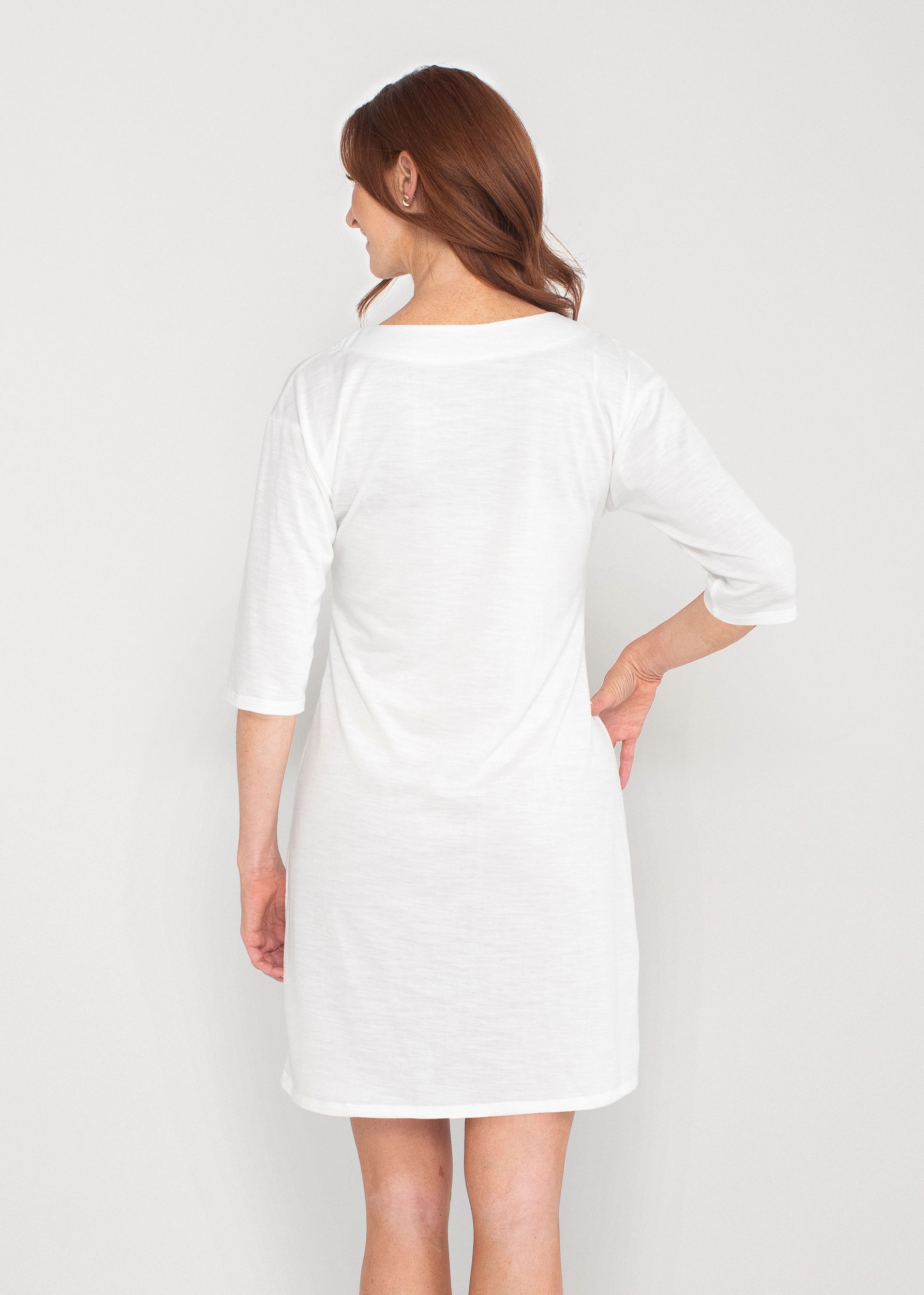 Be comfortable and fashionable all day in our soft Lucy fabric. This v-neck dress features loose 3/4 sleeves, drop shoulders and falls just at the knee. Your one-of-a-kind garment is created using all-over soft garment sublimation printing where selected designs are individually printed into your garment.