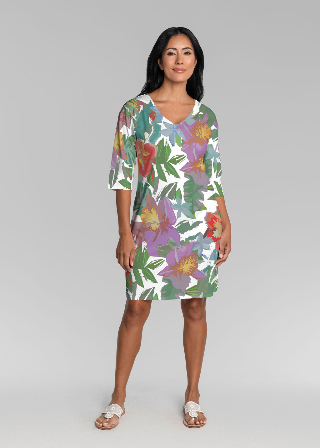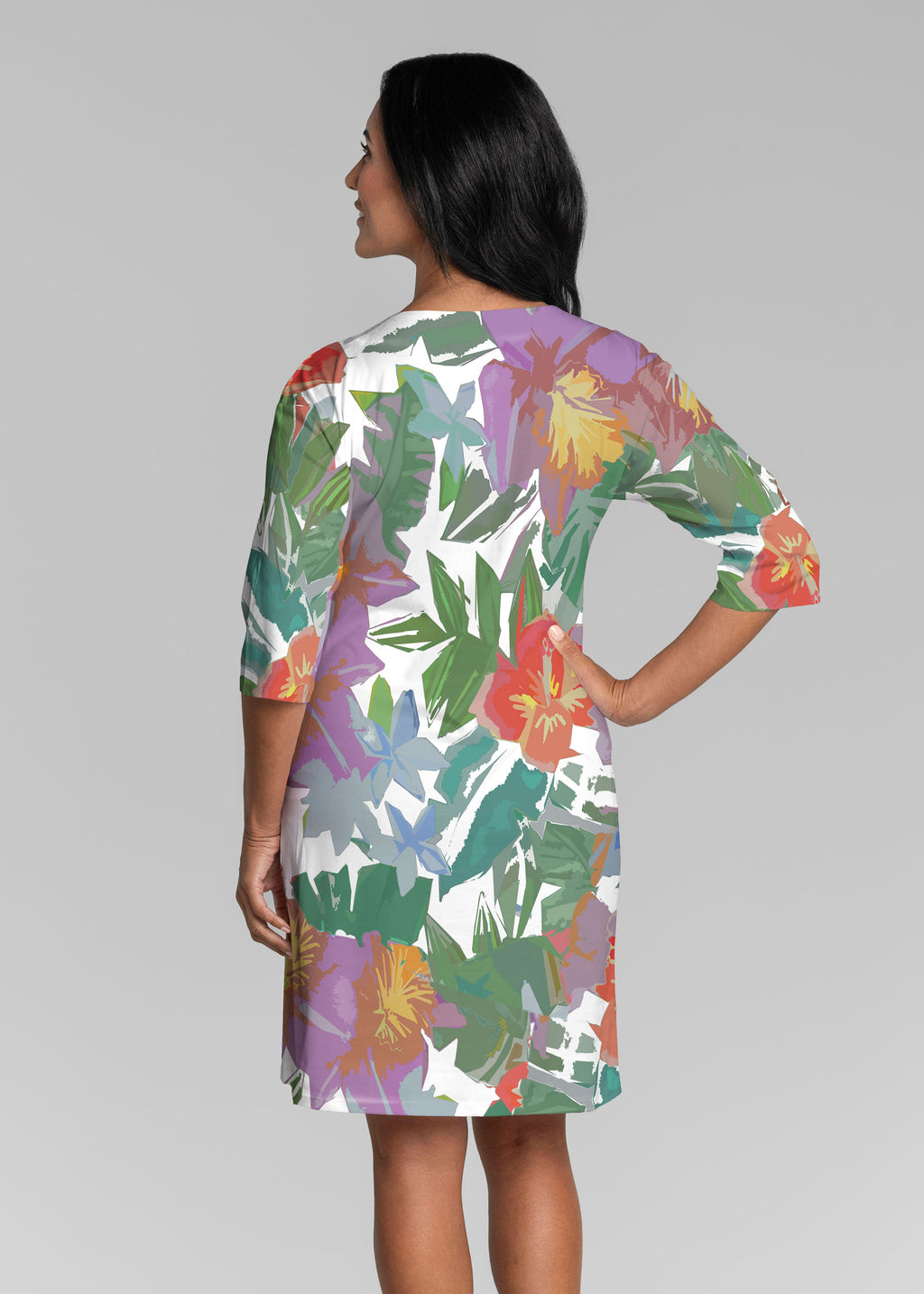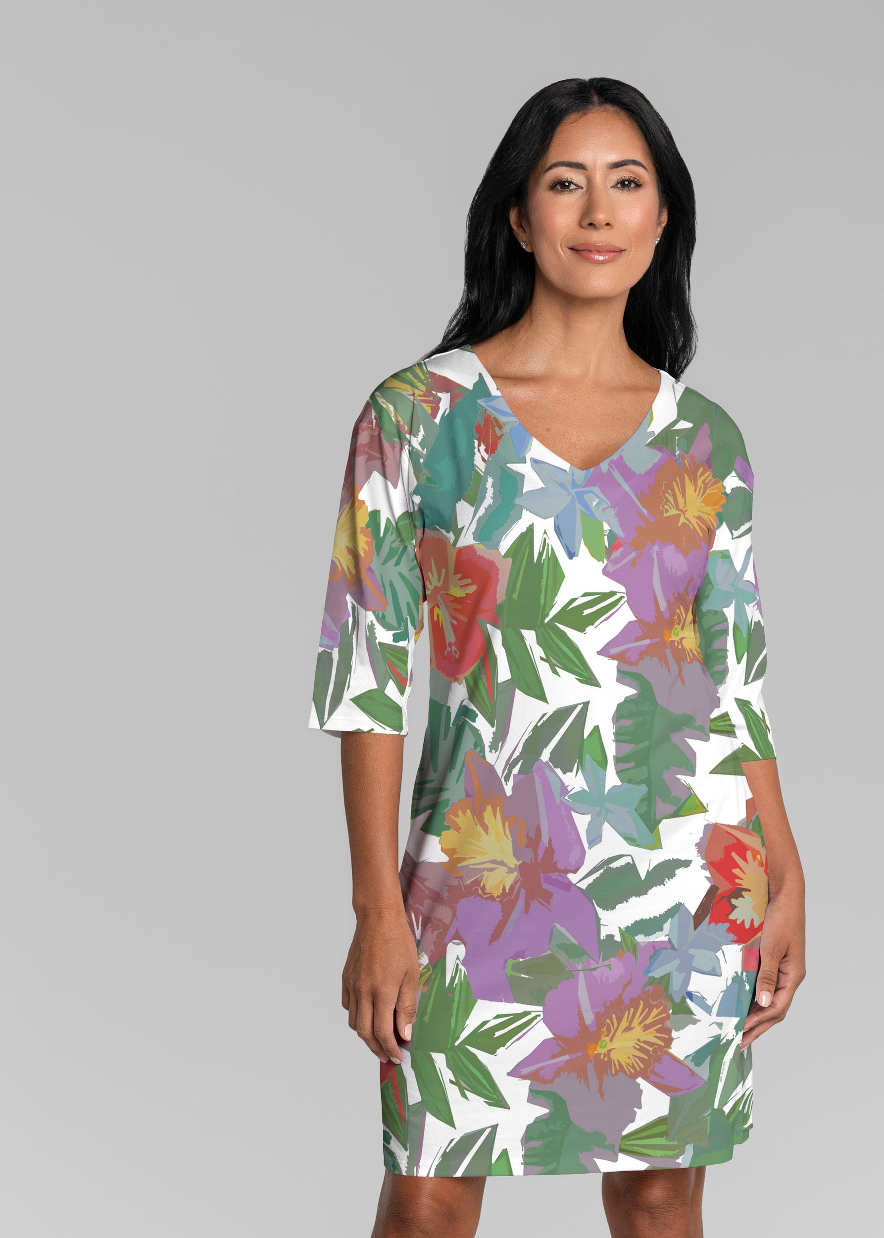 Be comfortable and fashionable all day in our soft Lucy fabric. This v-neck dress features loose 3/4 sleeves, drop shoulders and falls just at the knee.