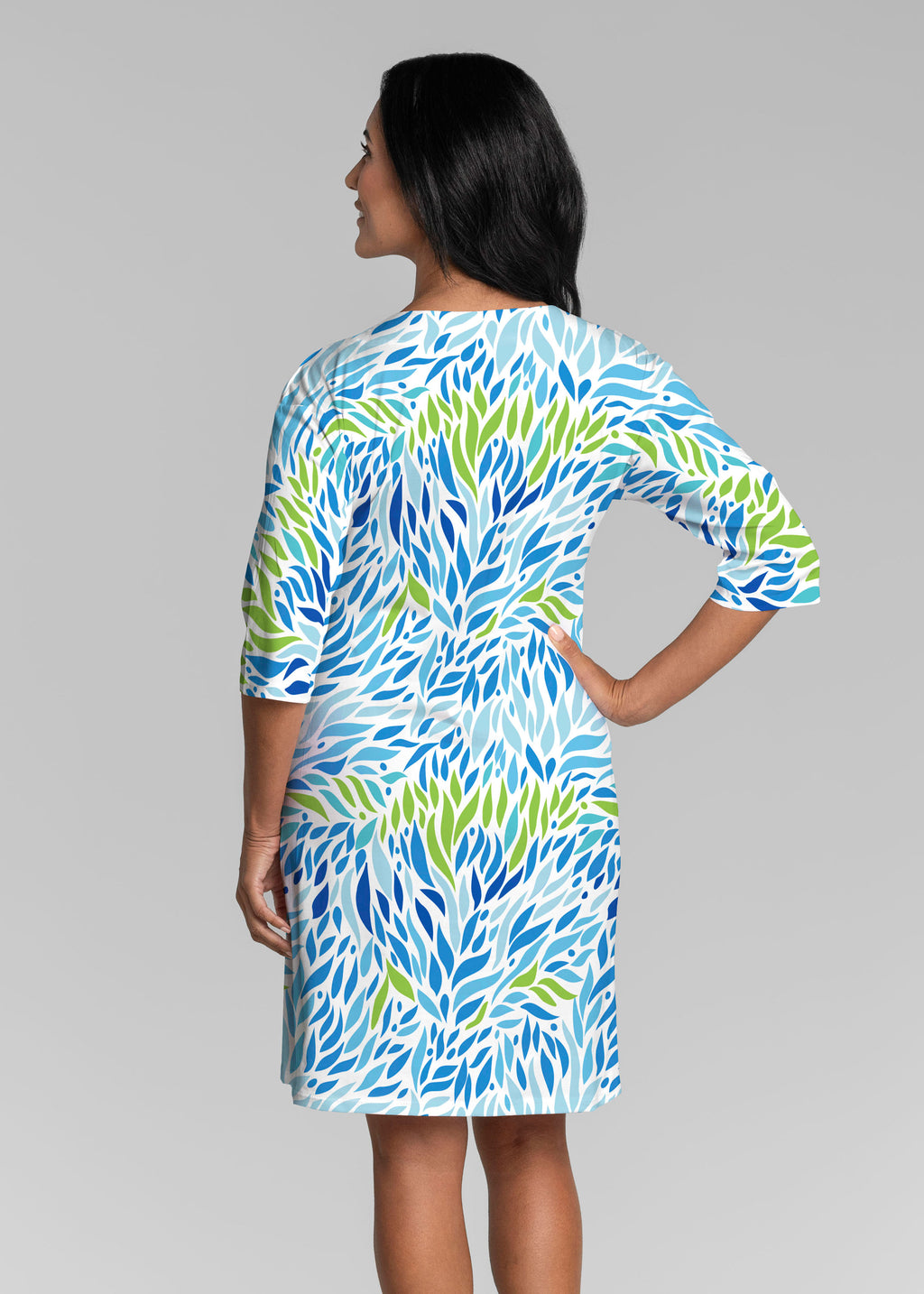Be comfortable and fashionable all day in our soft Lucy fabric. This v-neck dress features loose 3/4 sleeves, drop shoulders and falls just at the knee.