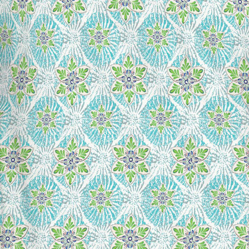 A summer tapestry print of turquoise and purple with a vibrant border design.