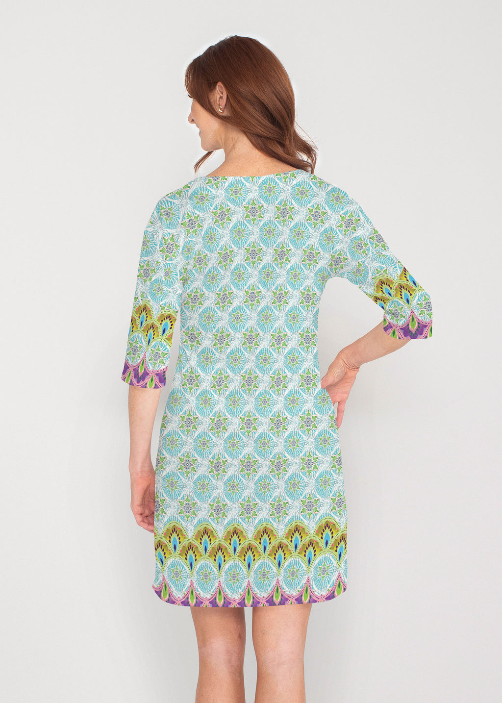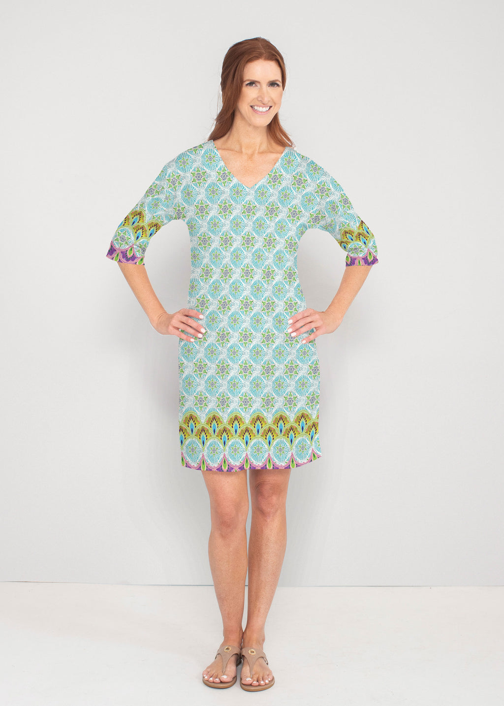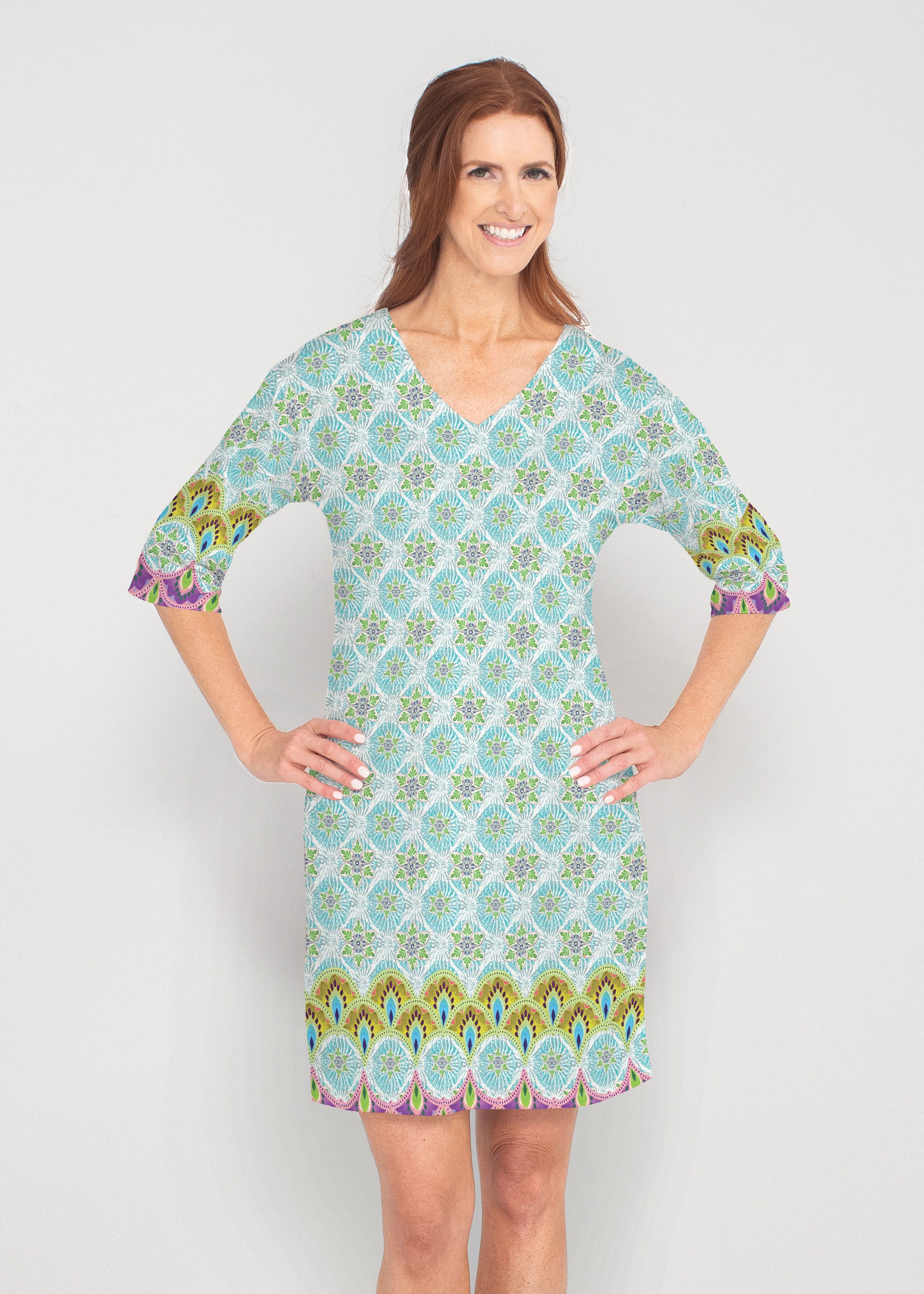 Be comfortable and fashionable all day in our soft Lucy fabric. This v-neck dress features loose 3/4 sleeves, drop shoulders and falls just at the knee.