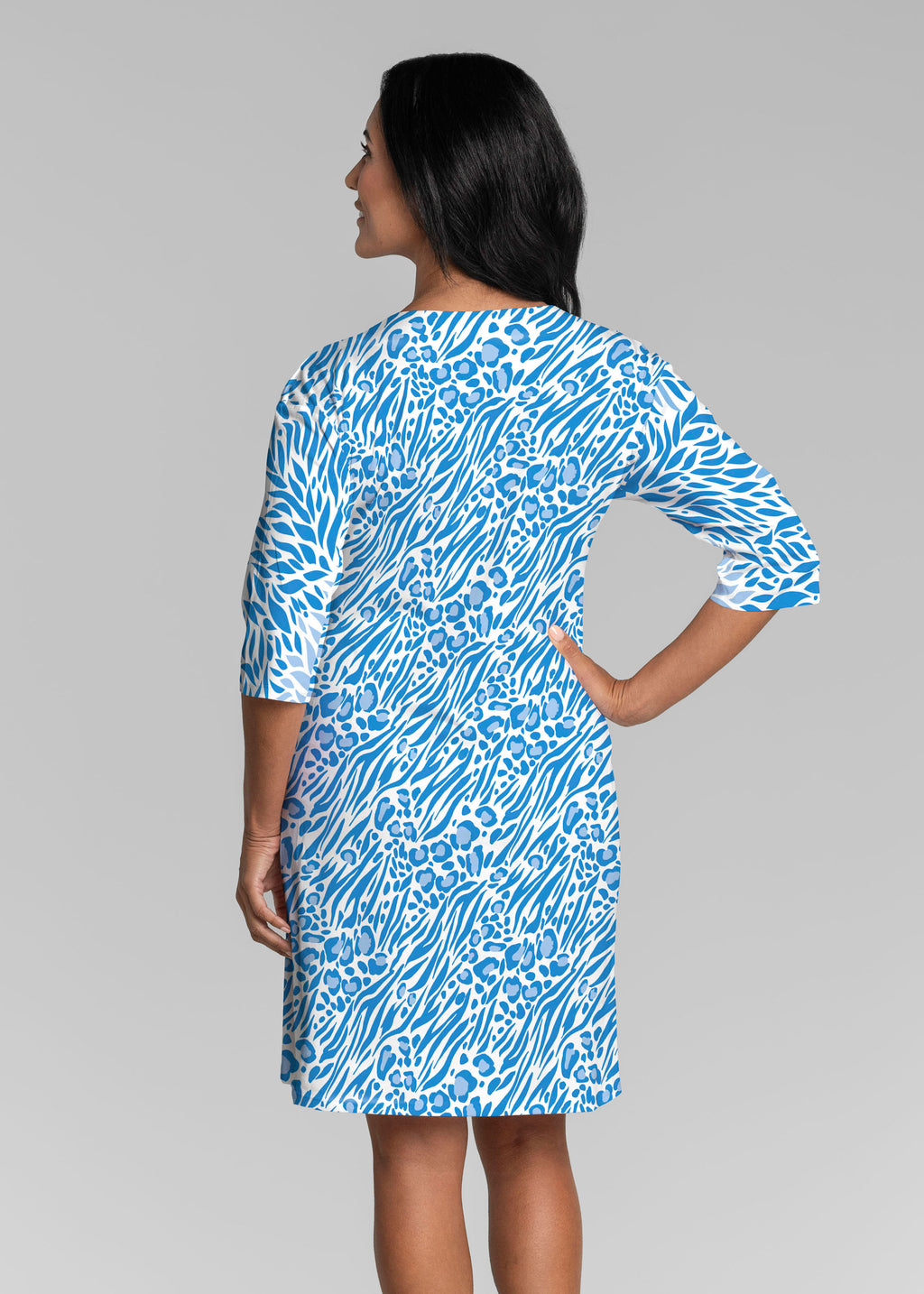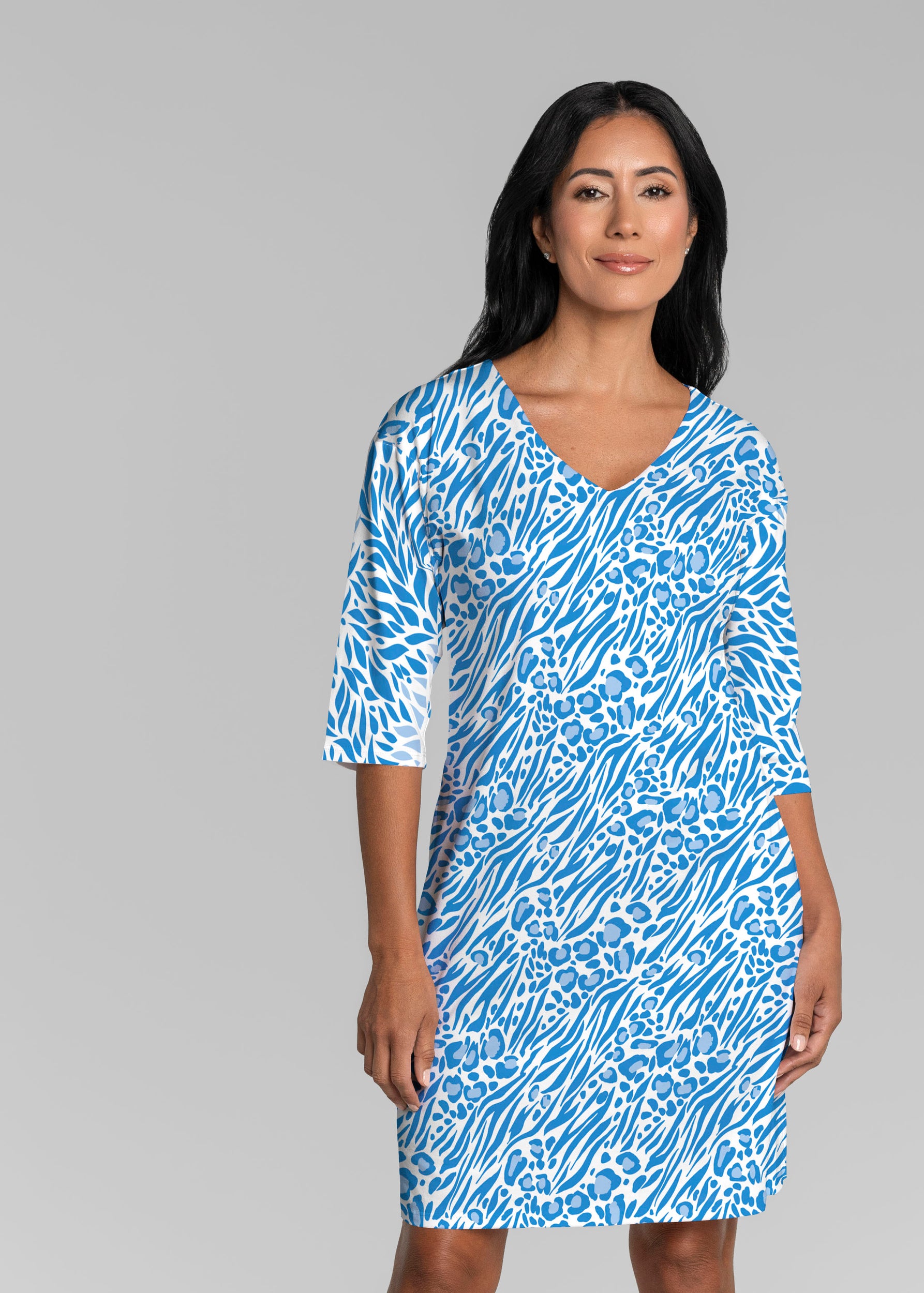 Be comfortable and fashionable all day in our soft Lucy fabric. This v-neck dress features loose 3/4 sleeves, drop shoulders and falls just at the knee.