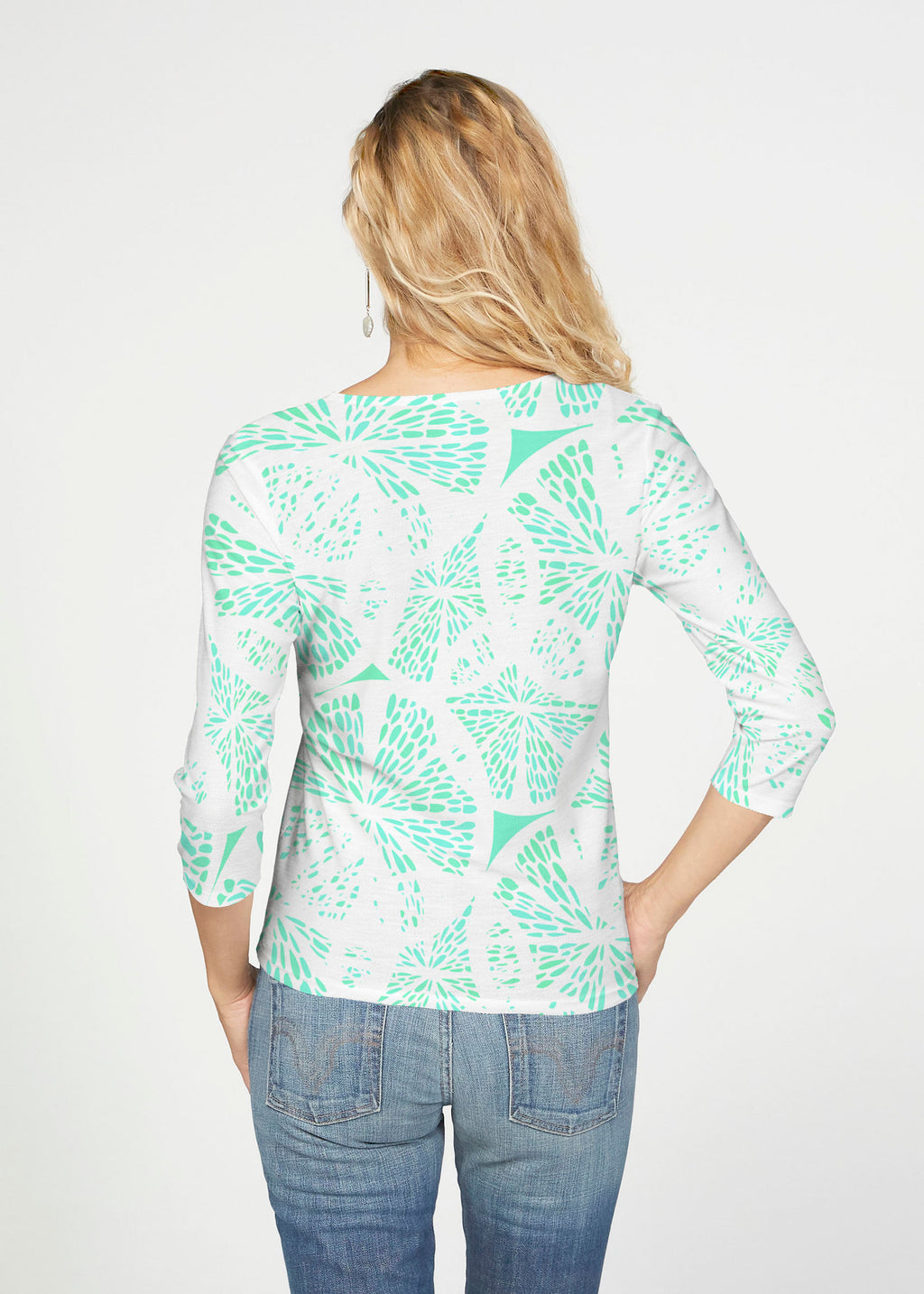 A fun citrus stamped print in aqua and white, designed by Susan Werner.