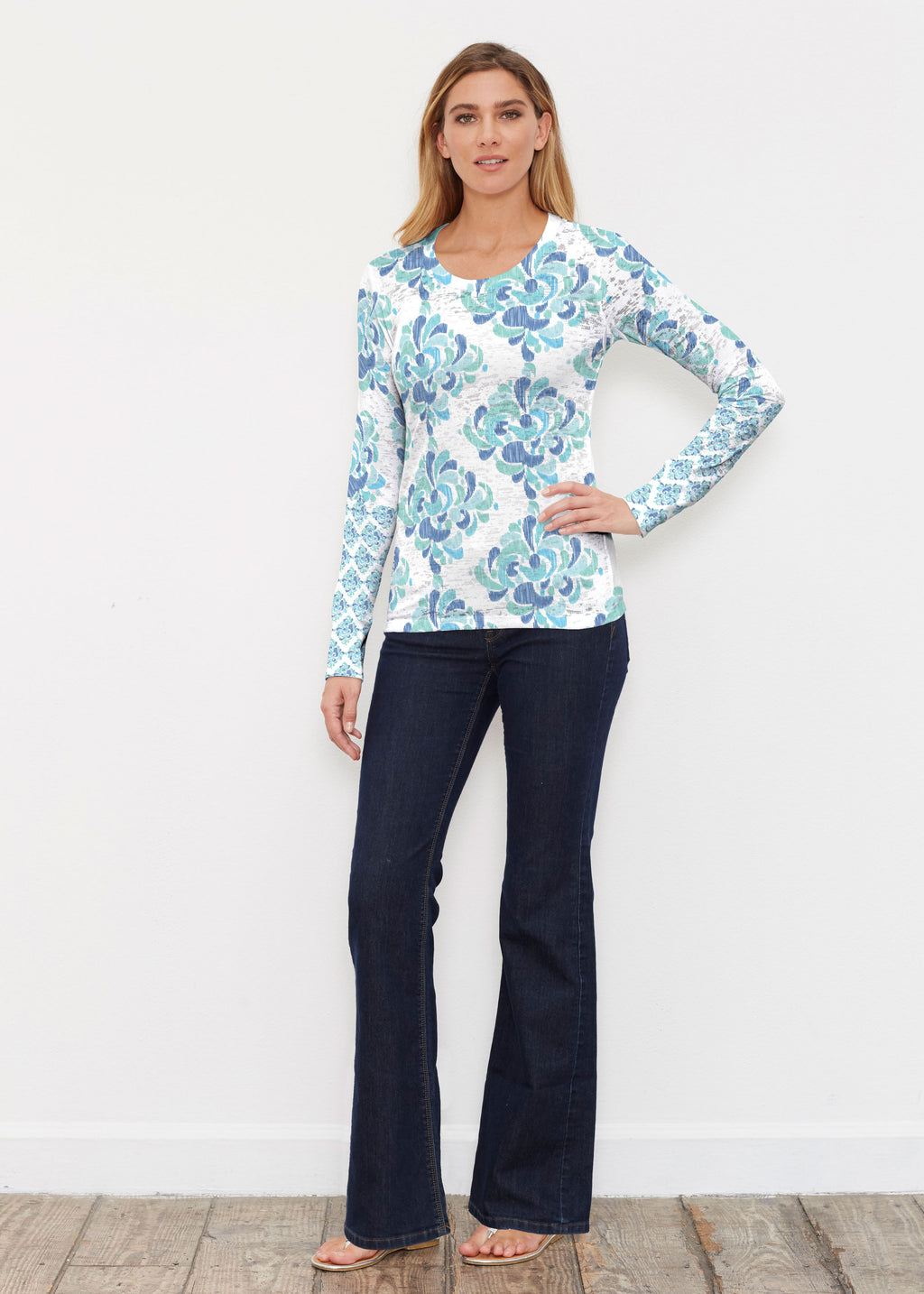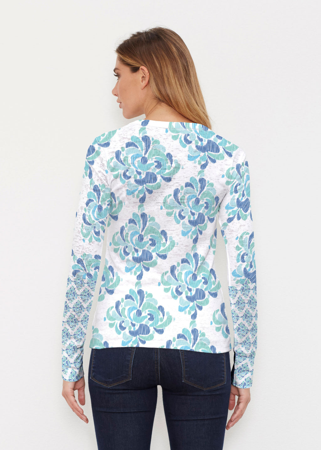 Beautiful shades of blue, aqua, turquoise and teal in captivating brushed baroque ornaments with a smaller and more dense pattern on the forearms. Designed by Susan Werner.