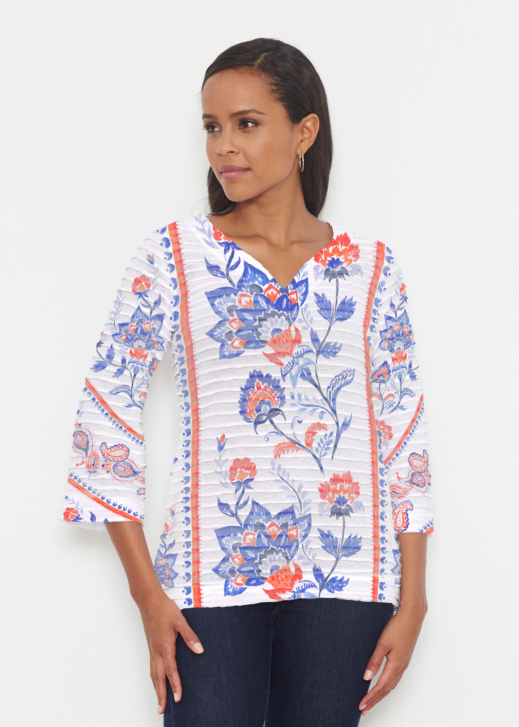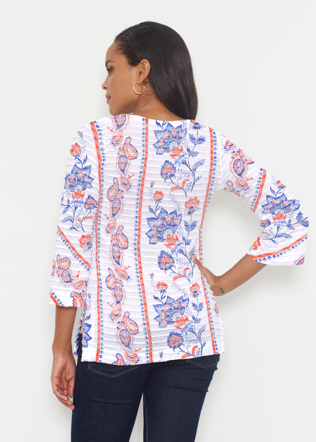 A vibrant hand painted floral and paisley print with stunning shades of blue, orange and white, designed by Susan Werner.