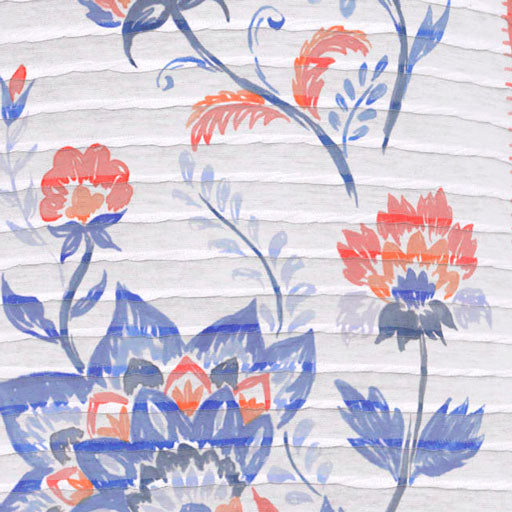 A vibrant hand painted floral and paisley print with stunning shades of blue, orange and white, designed by Susan Werner.