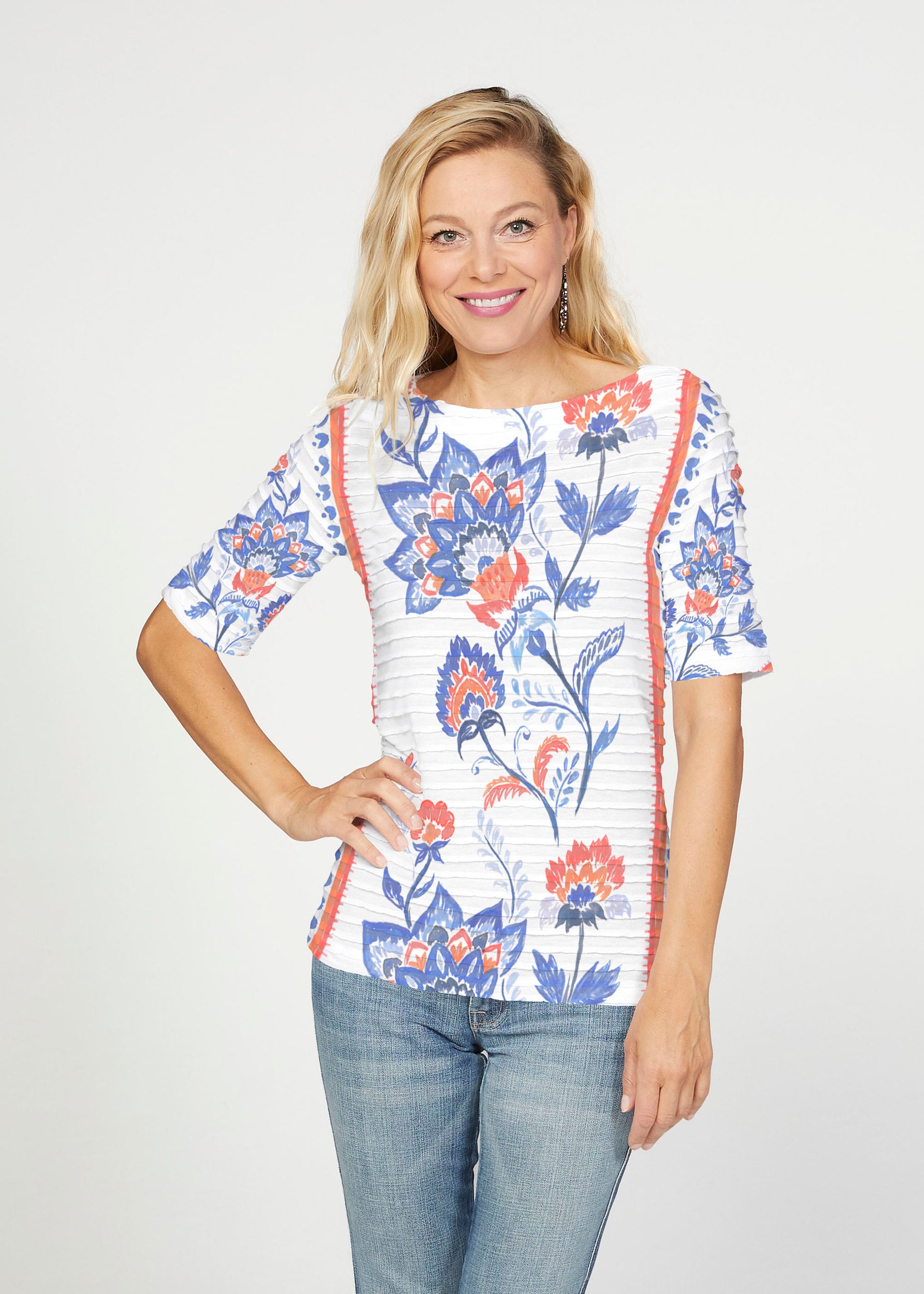 Bohemian Chintz (7847) ~ Banded Elbow Sleeve Boat Neck Top
