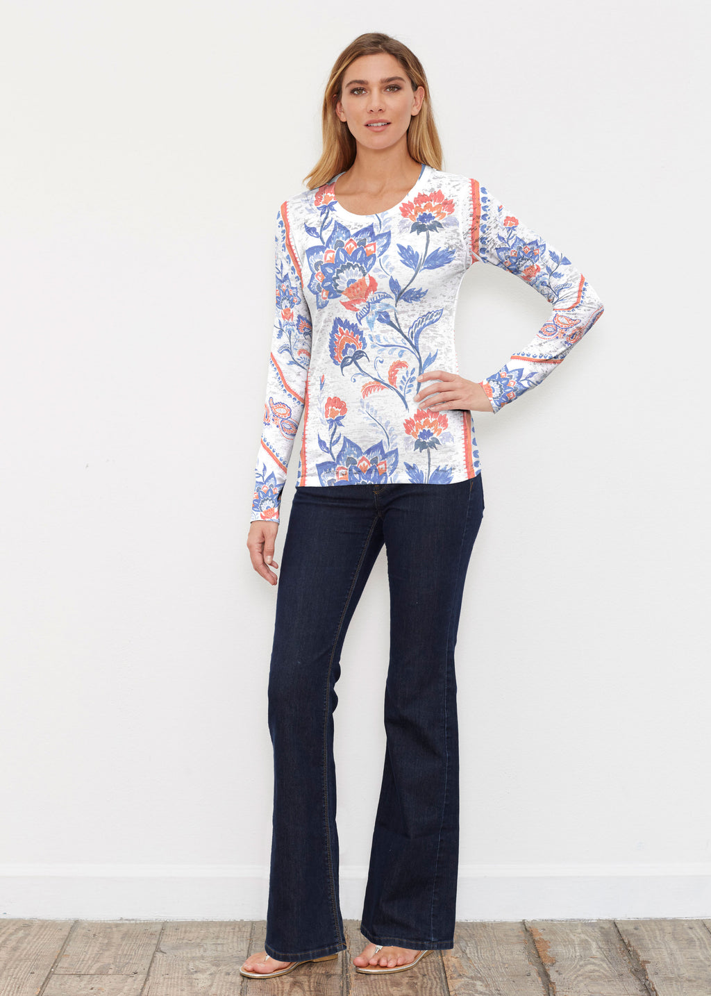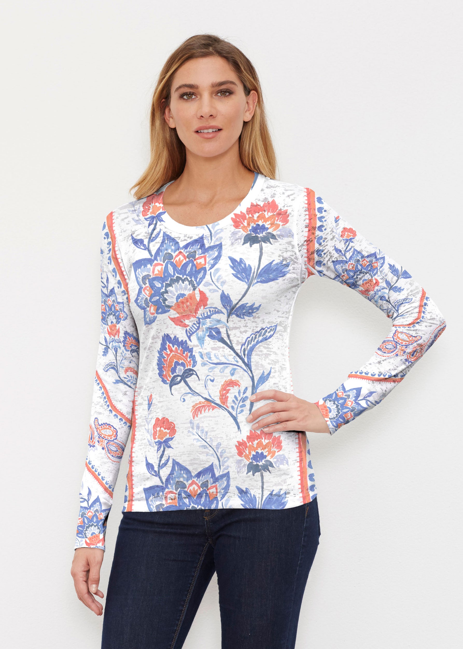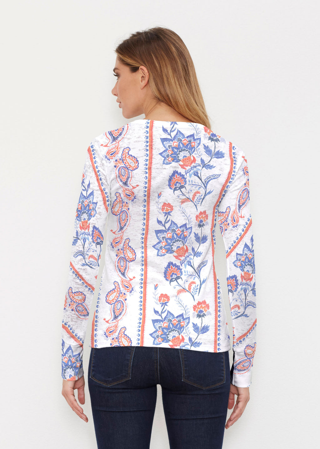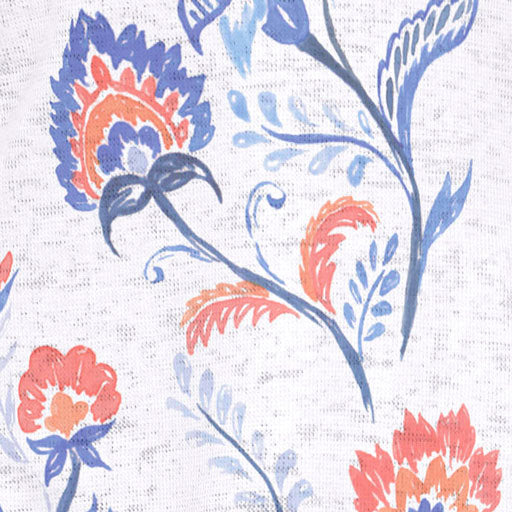 A vibrant hand painted floral and paisley print with stunning shades of blue, orange and white, designed by Susan Werner.