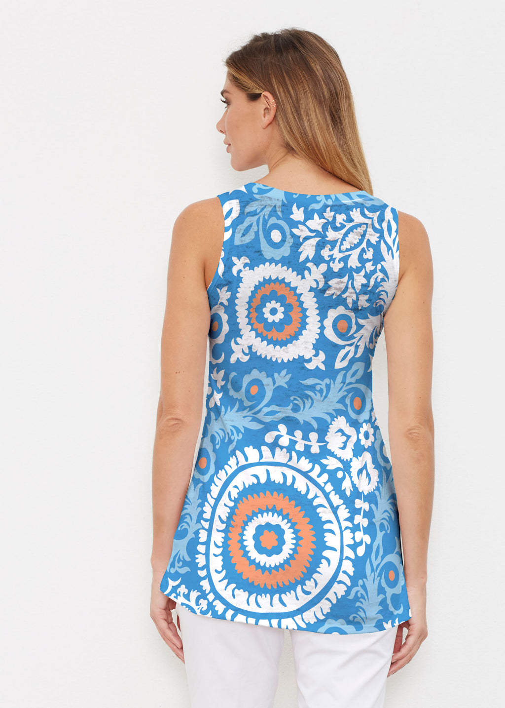 This tank is the perfect combination of an elegant shape with a sporty look. A high-low cascading hemline falls loosely over the hip in our Signature burnout fabric. No sleeves and a shallow scoop neckline give this tank its sporty vibe. -- Your one-of-a-kind garment is created using all-over soft garment sublimation printing. Selected designs are individually printed into your garment. Cotton/Polyester blend.