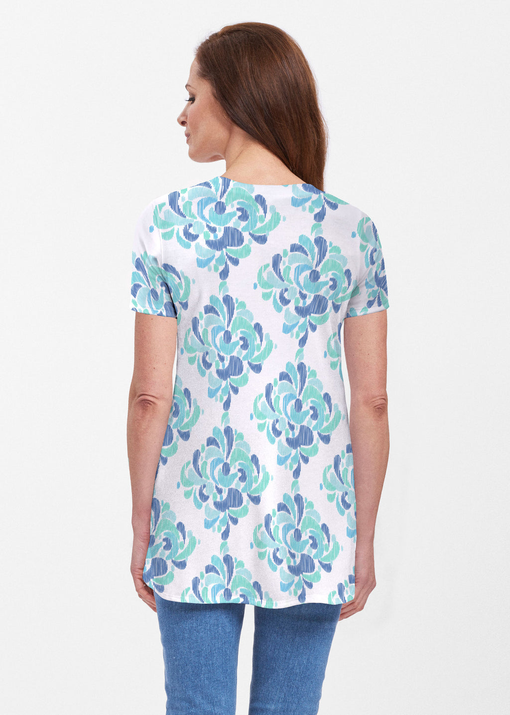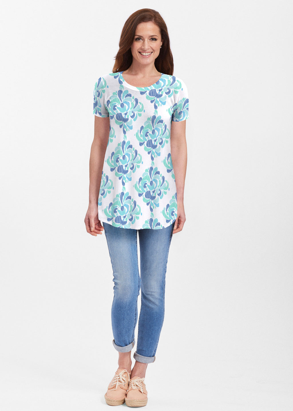 Our soft and feminine short sleeve silhouette tunic is sure to flatter any figure. Made in our Butterknit fabic that flows into a relaxed curved hem that is slightly longer in the back with subtle side slits.
