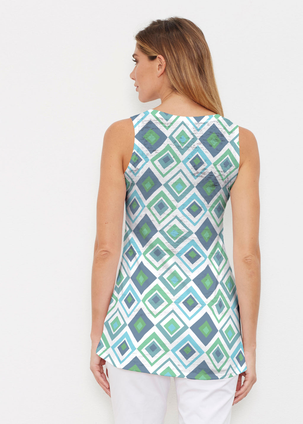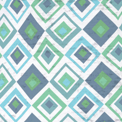 A simple yet sophisticated geometric print with playful diamond shapes of aqua, navy and green designed by Susan Werner.