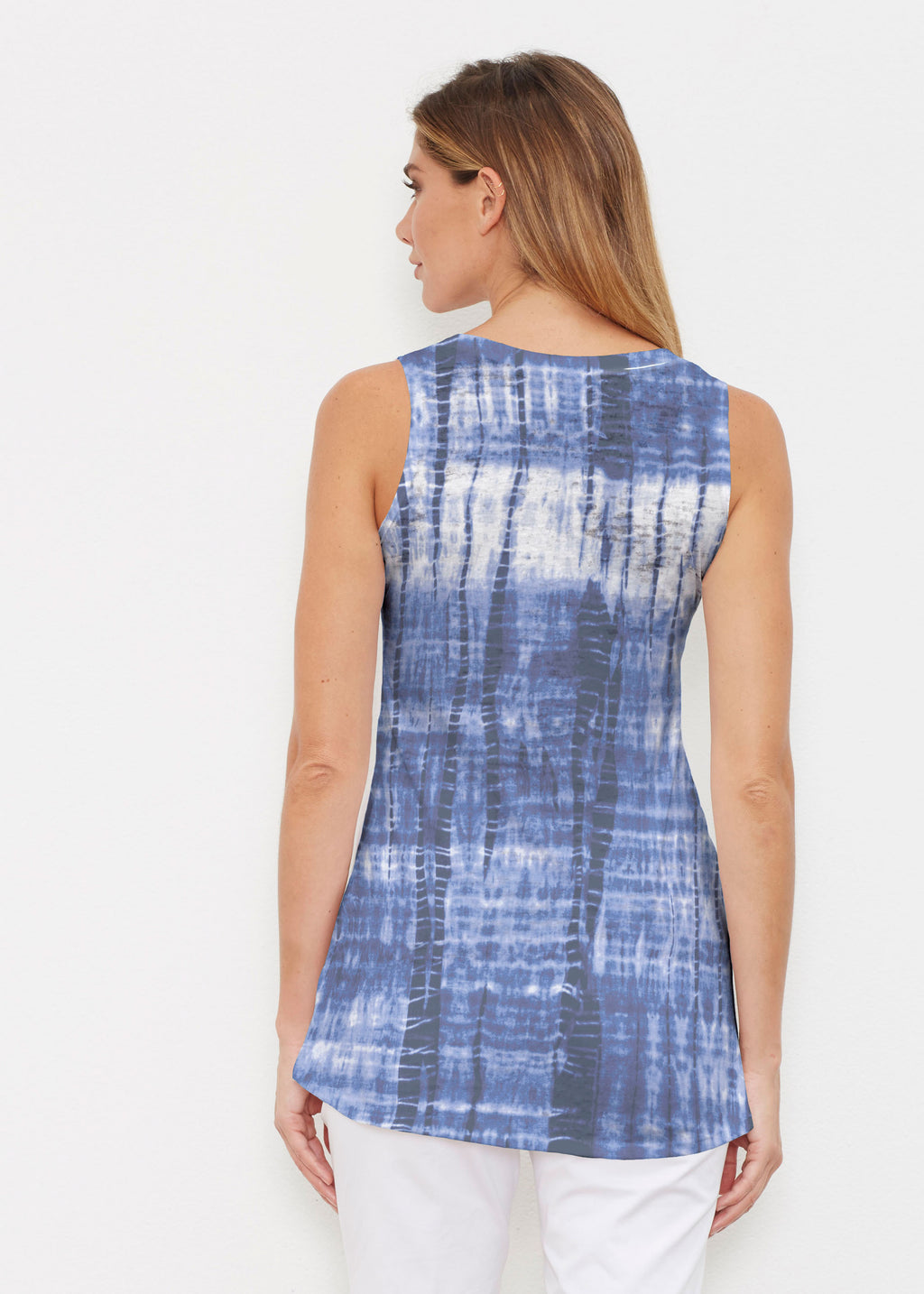 This tank is the perfect combination of an elegant shape with a sporty look. A high-low cascading hemline falls loosely over the hip in our Signature burnout fabric. No sleeves and a shallow scoop neckline give this tank its sporty vibe. -- Your one-of-a-kind garment is created using all-over soft garment sublimation printing. Selected designs are individually printed into your garment. Cotton/Polyester blend.