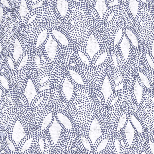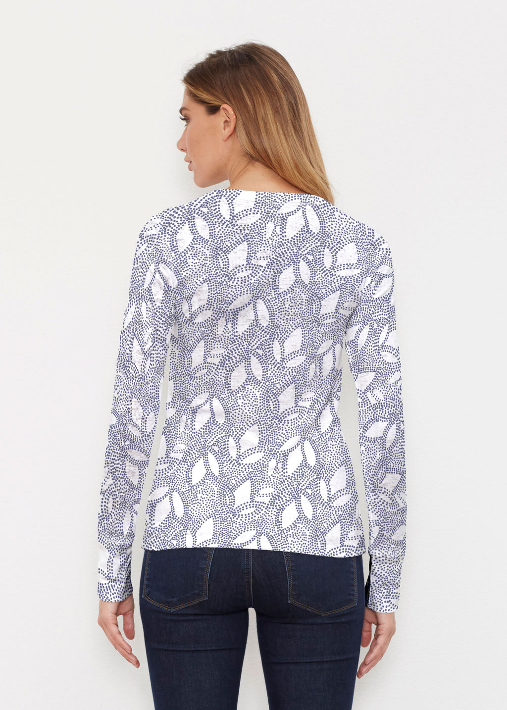 A playful floral dot pattern in blue with contrasting print scale on the back and sleeves. Designed by Susan Werner.