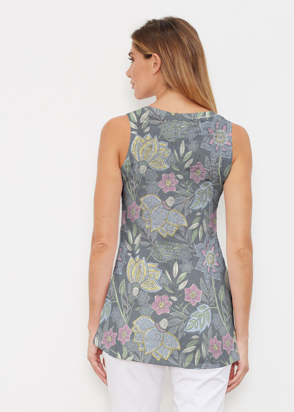 This tank is the perfect combination of an elegant shape with a sporty look. A high-low cascading hemline falls loosely over the hip in our Signature burnout fabric. No sleeves and a shallow scoop neckline give this tank its sporty vibe. -- Your one-of-a-kind garment is created using all-over soft garment sublimation printing. Selected designs are individually printed into your garment. Cotton/Polyester blend.