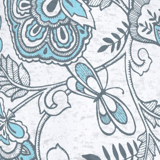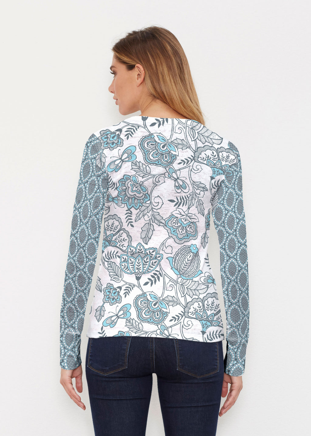 Beautiful floral print in navy and aqua with contrasting sleeves designed by Diane Kappa.