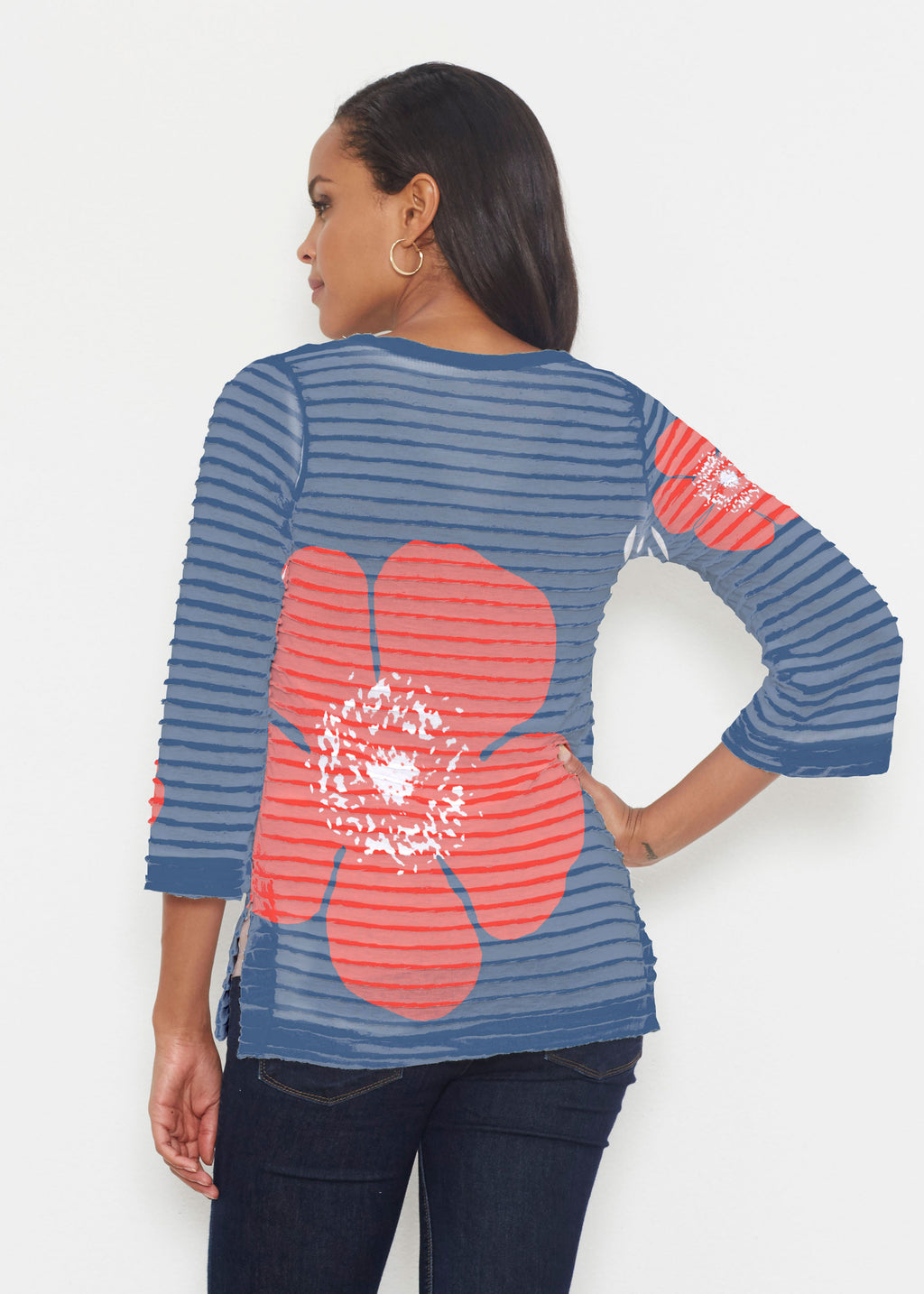 This print features small poppies on the front with a large poppy on back in navy and red. This classic favorite designed by Susan Werner.