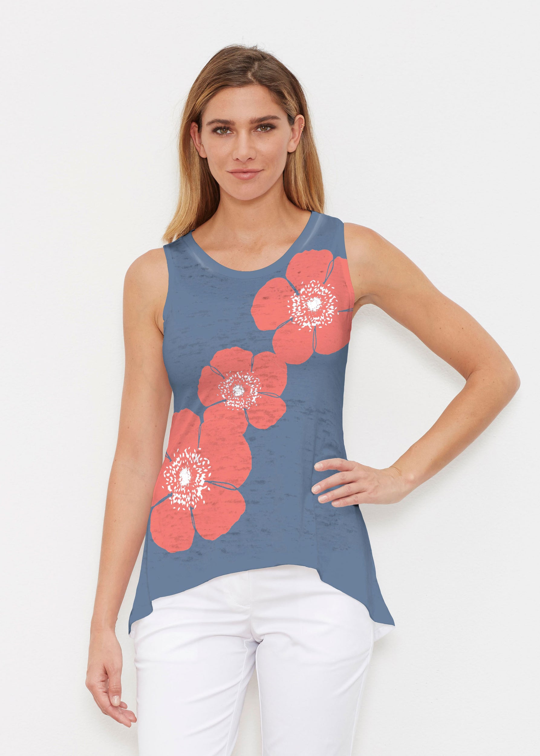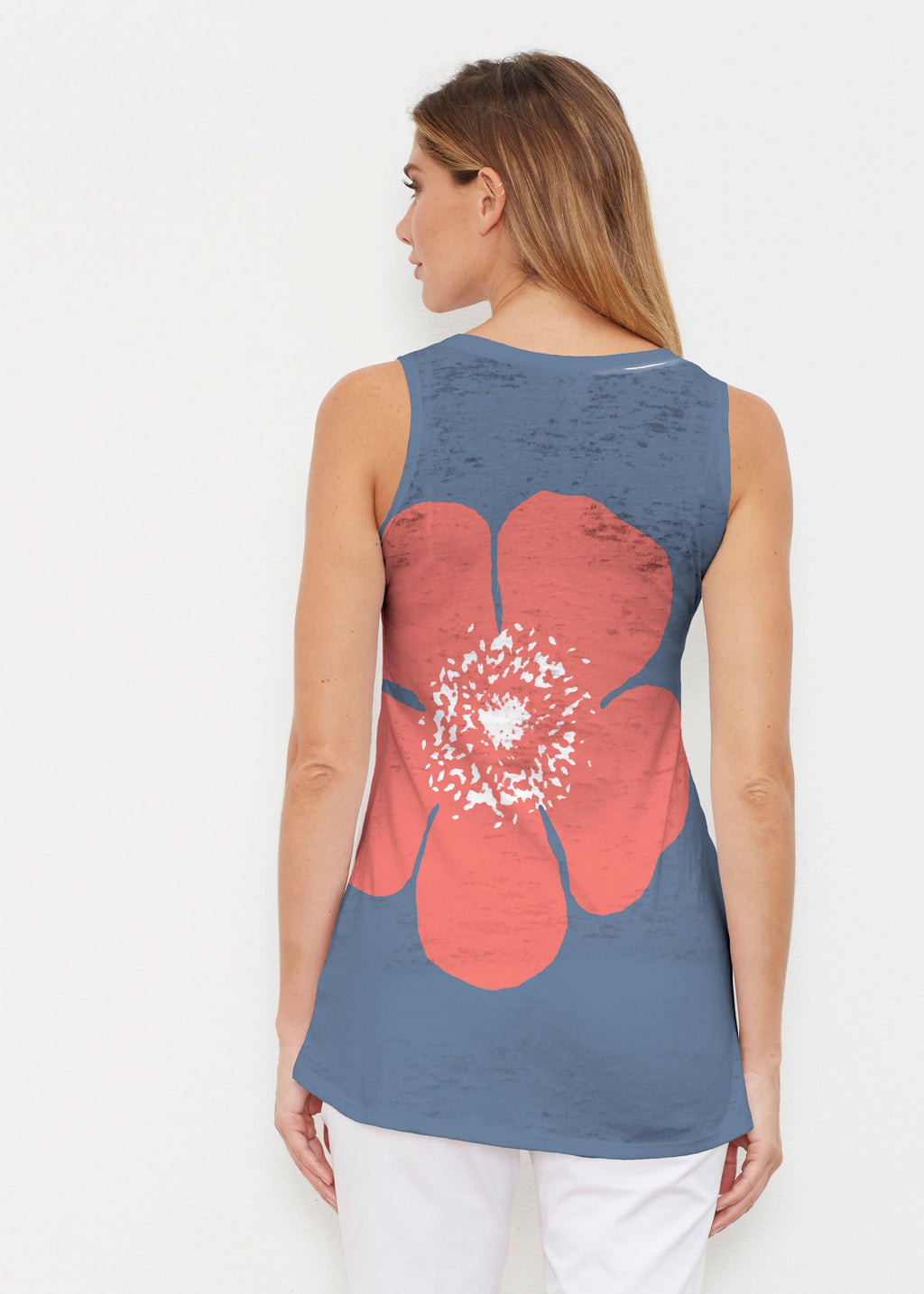 This tank is the perfect combination of an elegant shape with a sporty look. A high-low cascading hemline falls loosely over the hip in our Signature burnout fabric. No sleeves and a shallow scoop neckline give this tank its sporty vibe.