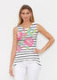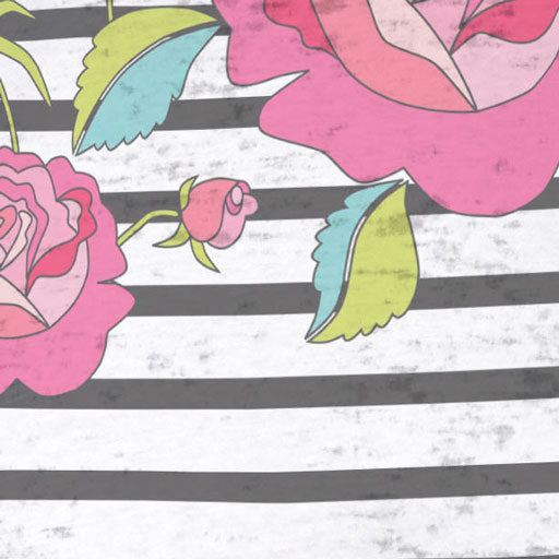 A playful black and white stripe print with beautiful rose line art overlays. Designed by Debra Valencia.