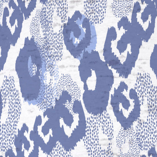 A striking and playful print of mottled, abstract geometrics in shades of blue designed by Susan Werner.
