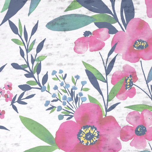 A stunning and romantic pink floral print with foliage and accent florals with contrasting dot pattern on the sleeve. Designed by Diane Kappa.