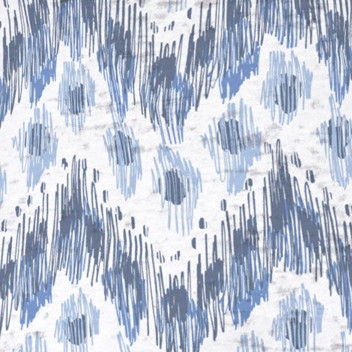 Intricate hatched lines form abstract ikat patterns that flow in a visually striking chevron design in cool shades of navy, cobalt blue and aqua. Designed by Susan Werner.