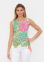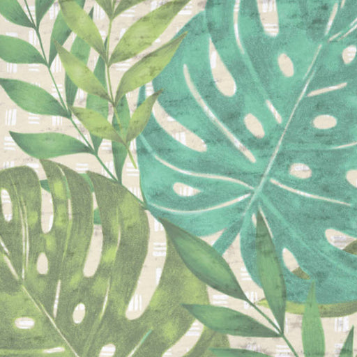 Run through the jungle with this tropical inspired print of jungle leaves in shades of green and a vibrant pink solitary begonia bloom on a beige background with a subtle crosshatch pattern and striped mixed sleeves. Designed by Diane Kappa.