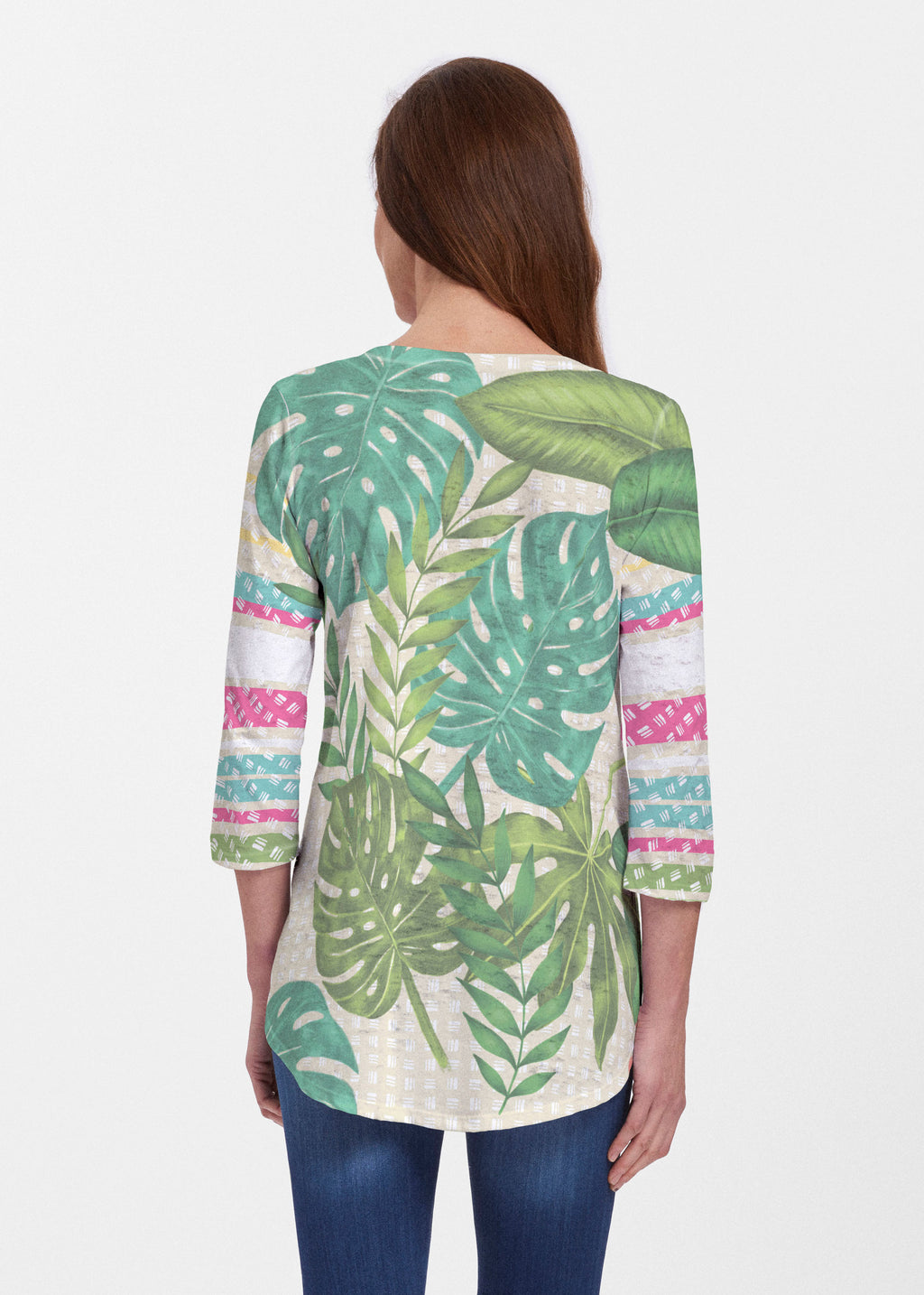 Run through the jungle with this tropical inspired print of jungle leaves in shades of green and a vibrant pink solitary begonia bloom on a beige background with a subtle crosshatch pattern and striped mixed sleeves. Designed by Diane Kappa.