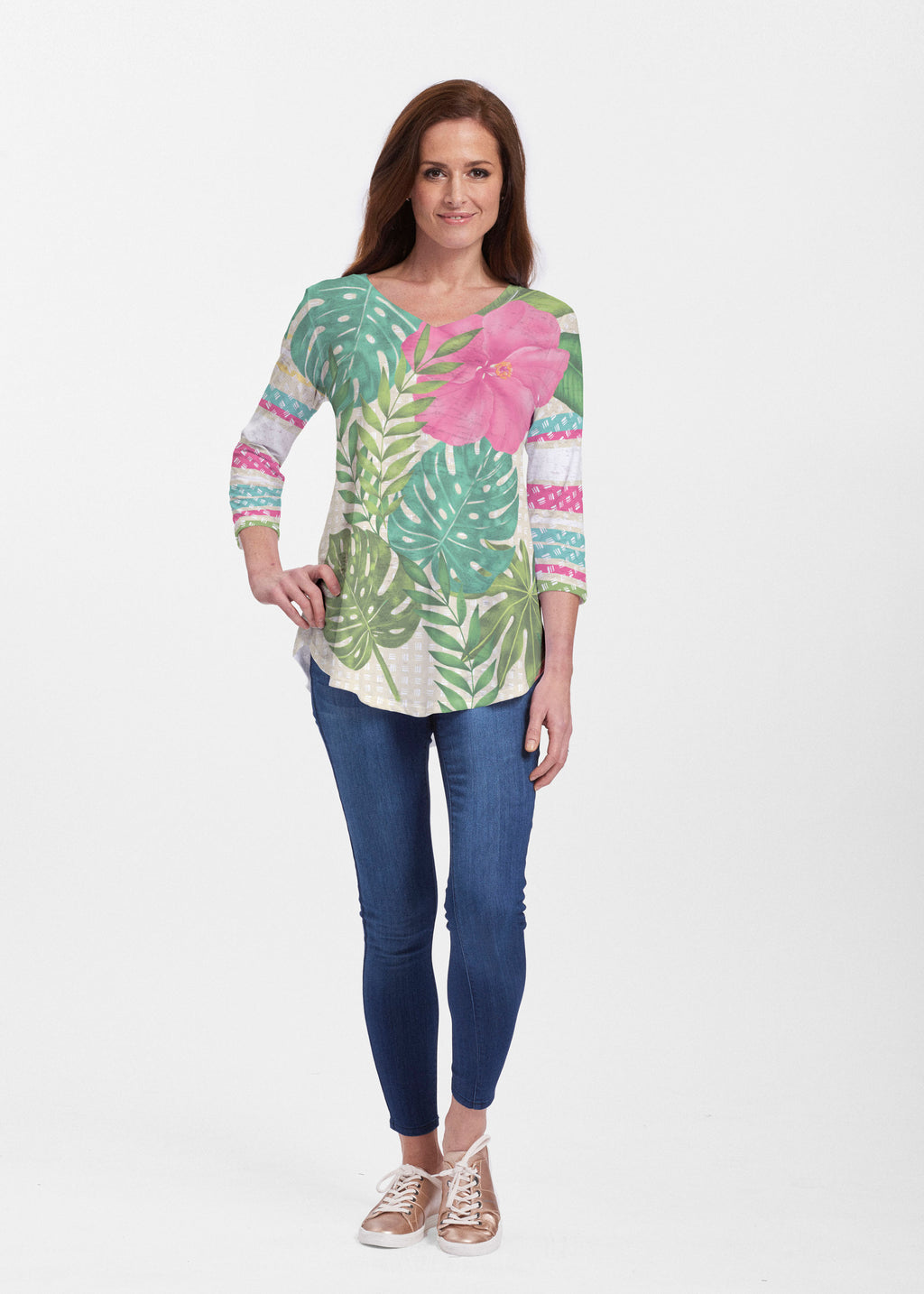 This v-neck tunic in our Signature burnout fabric is forever flattering. 3/4 sleeves and a v-neck flow into a full, swinging shirttail hem.