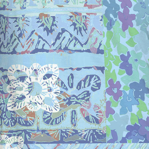 A playful collage of floral geometrics in aqua, purple and lime with patches of white.