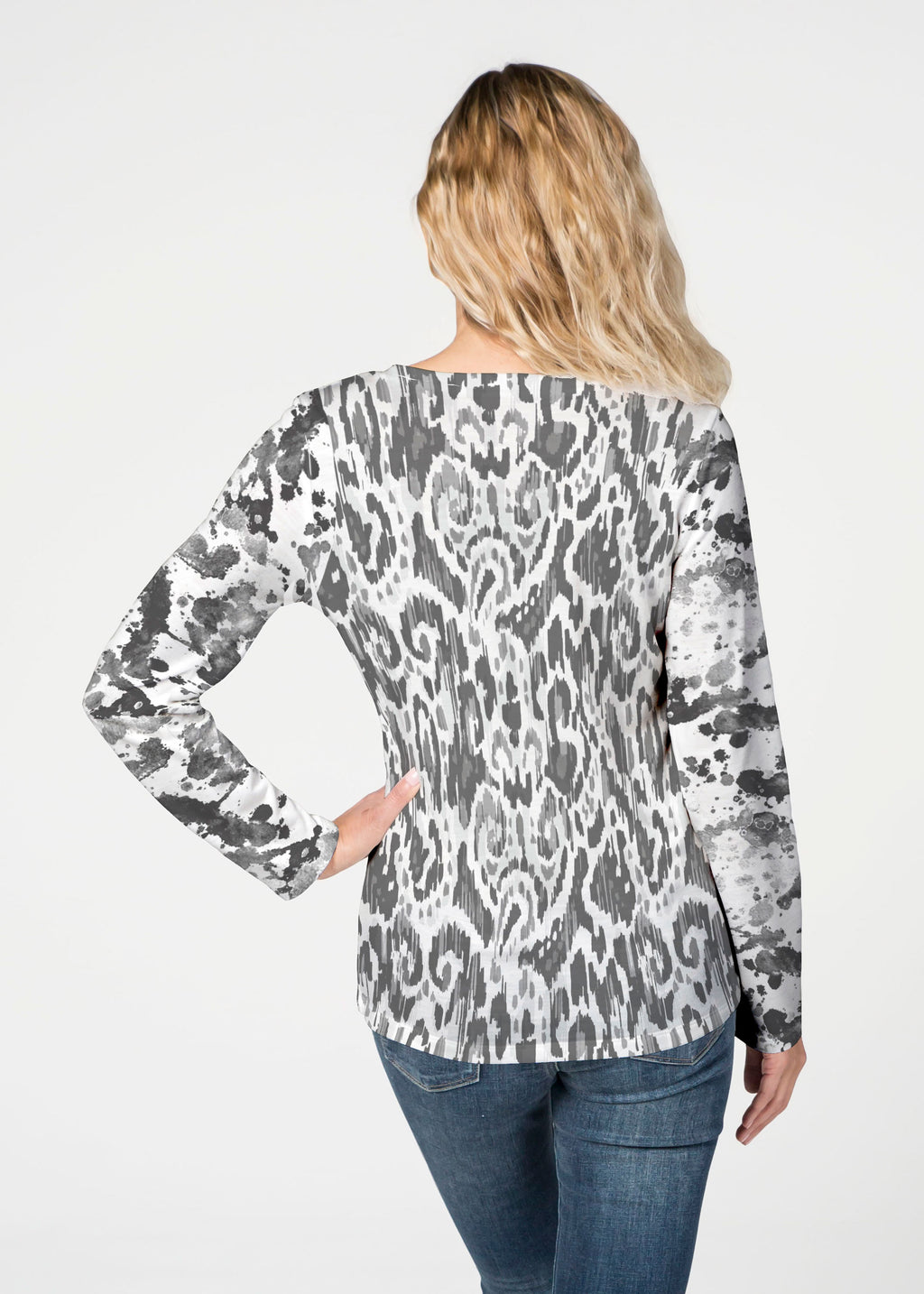 Our French Terry top is comfort and style all in one! Our French Terry top that features long sleeves, a V-neck and a more fitted silhouette that looks stylish in any print.