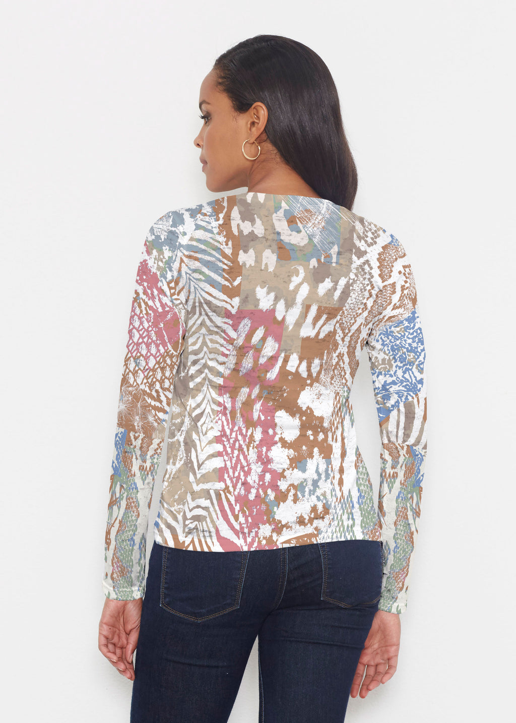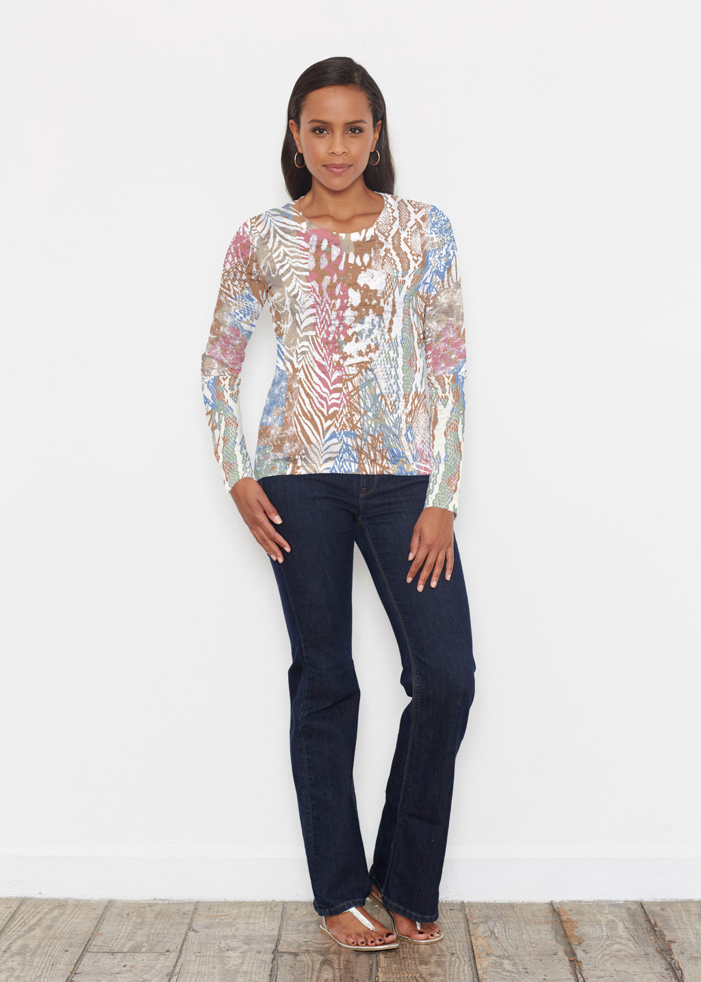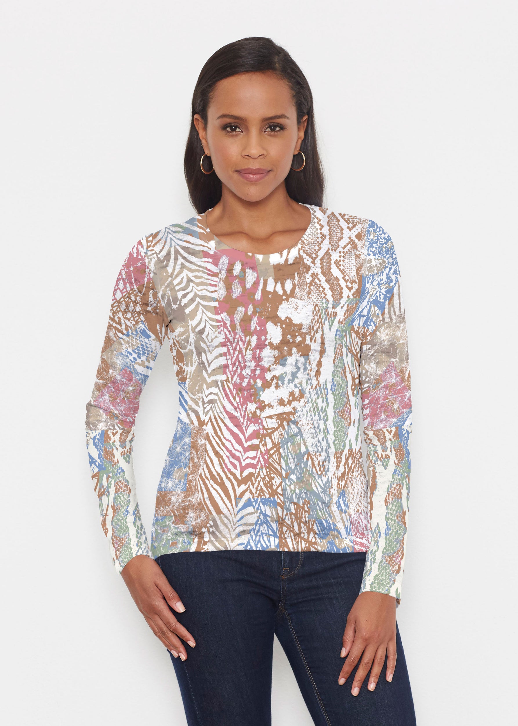 A stunning and sophisticated mixed animal print in beautiful neutral colors with a pop of blue and pink. Designed by Susan Werner.