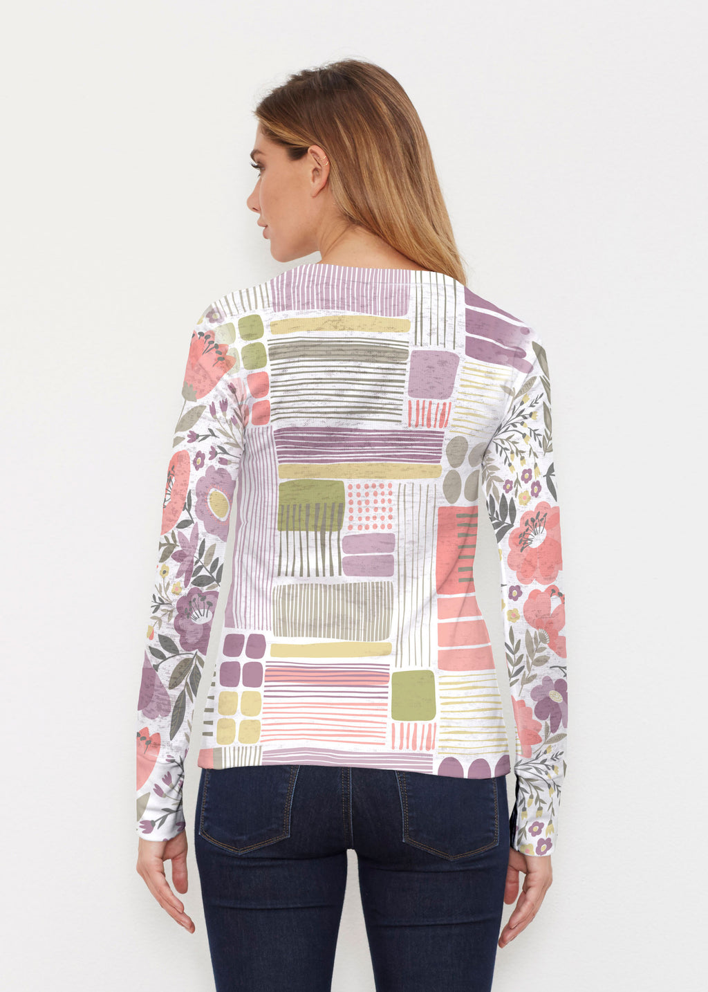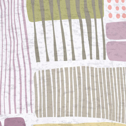 A touch of mid-century modern using abstract lines and blocks with mixed floral sleeves in shades of purple, green, coral and gold designed by Diane Kappa.