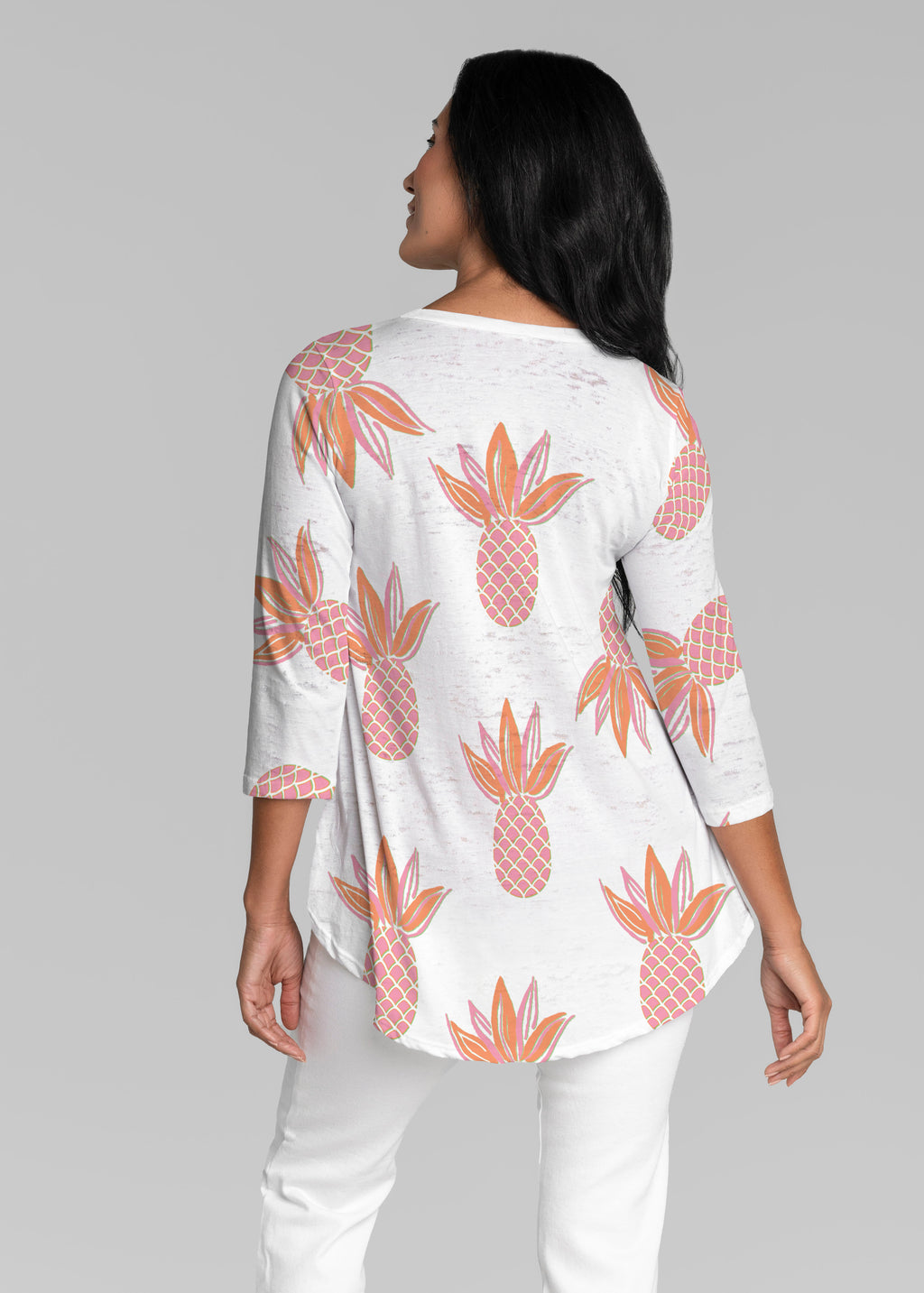 This v-neck tunic in our Signature burnout fabric is forever flattering. 3/4 sleeves and a v-neck flow into a full, swinging shirttail hem.
