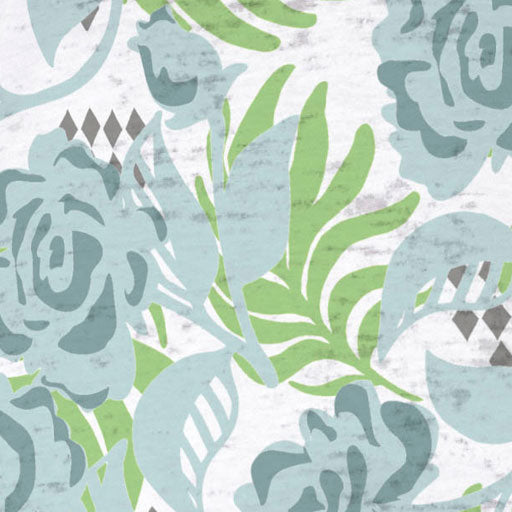 Playful floral print in light blue and lime green with black and white checkered accents.