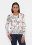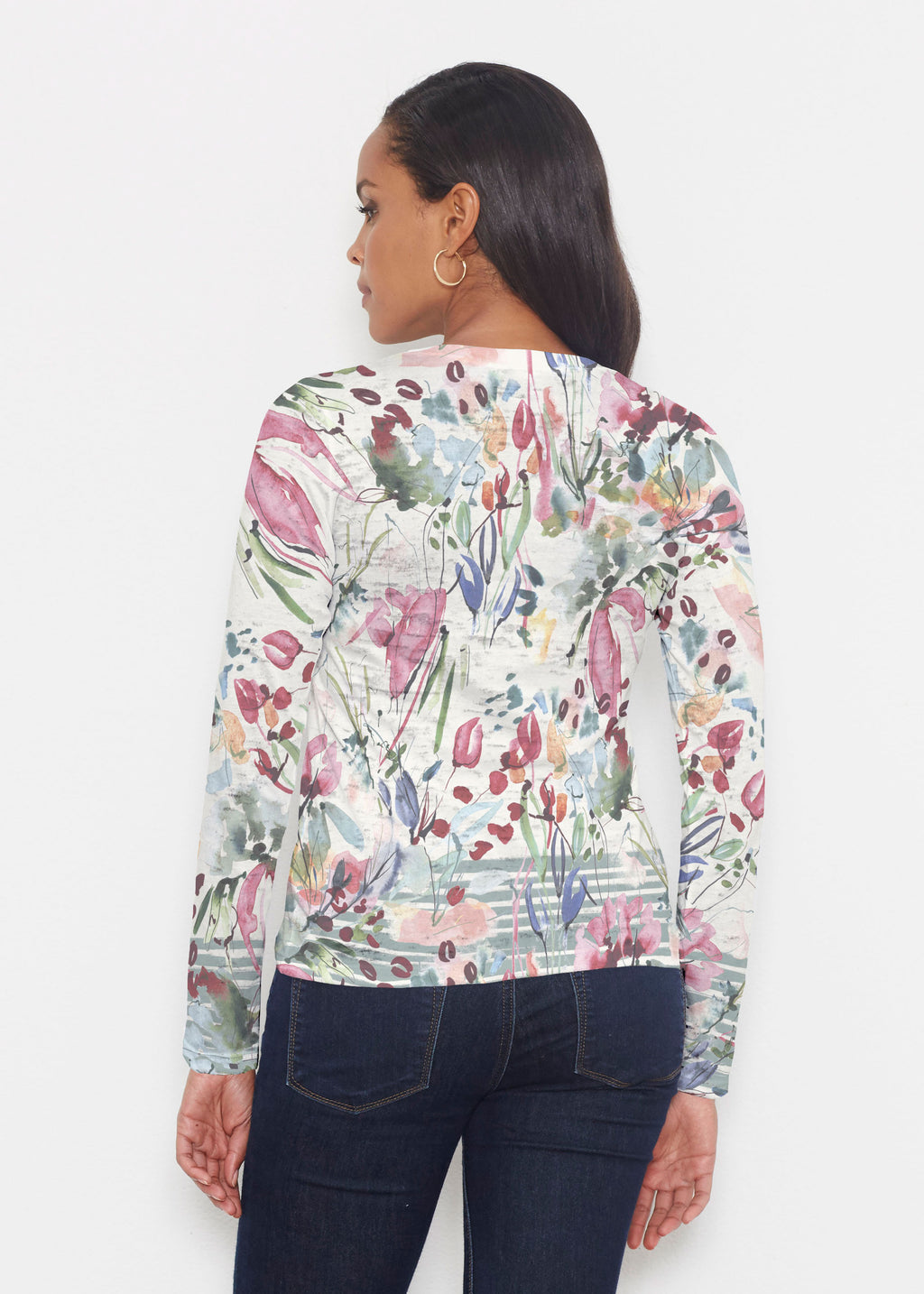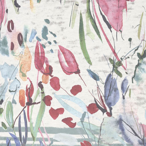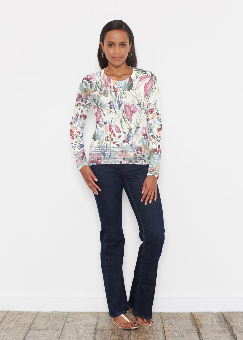 A beautiful print with soft & subtle watercolor floral blooms on a cream background with contrasting green stripes at the hem and cuffs. Designed by Sara Berrenson.