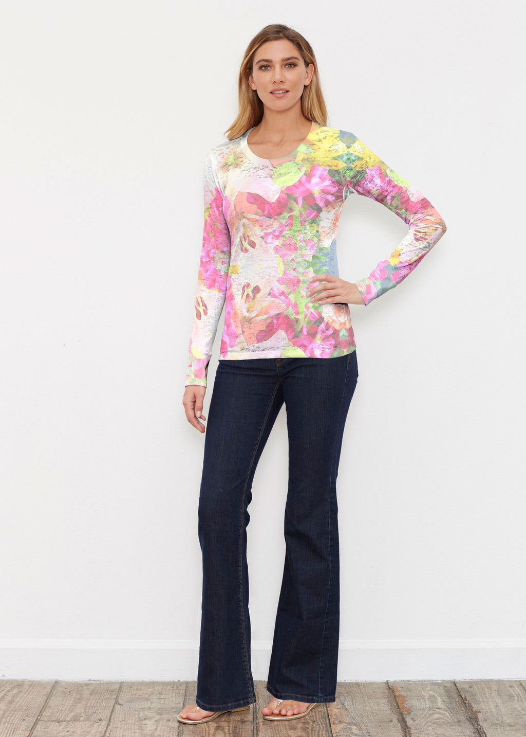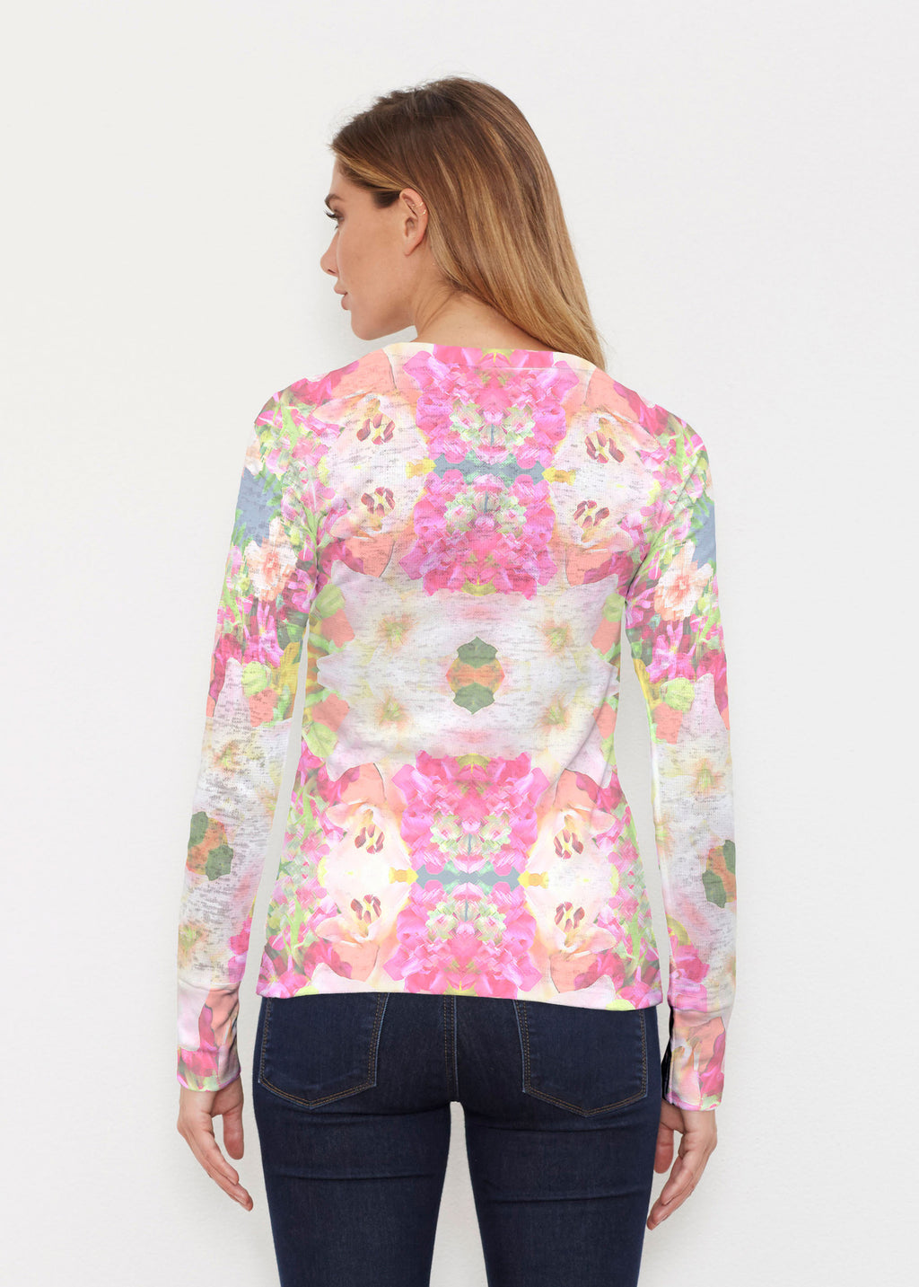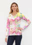 Abstract floral print with shades of fuchsia, light pink, yellow and green designed by Diane Kappa .