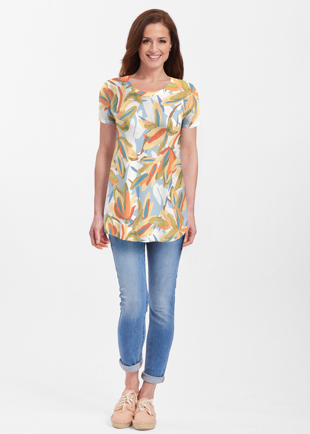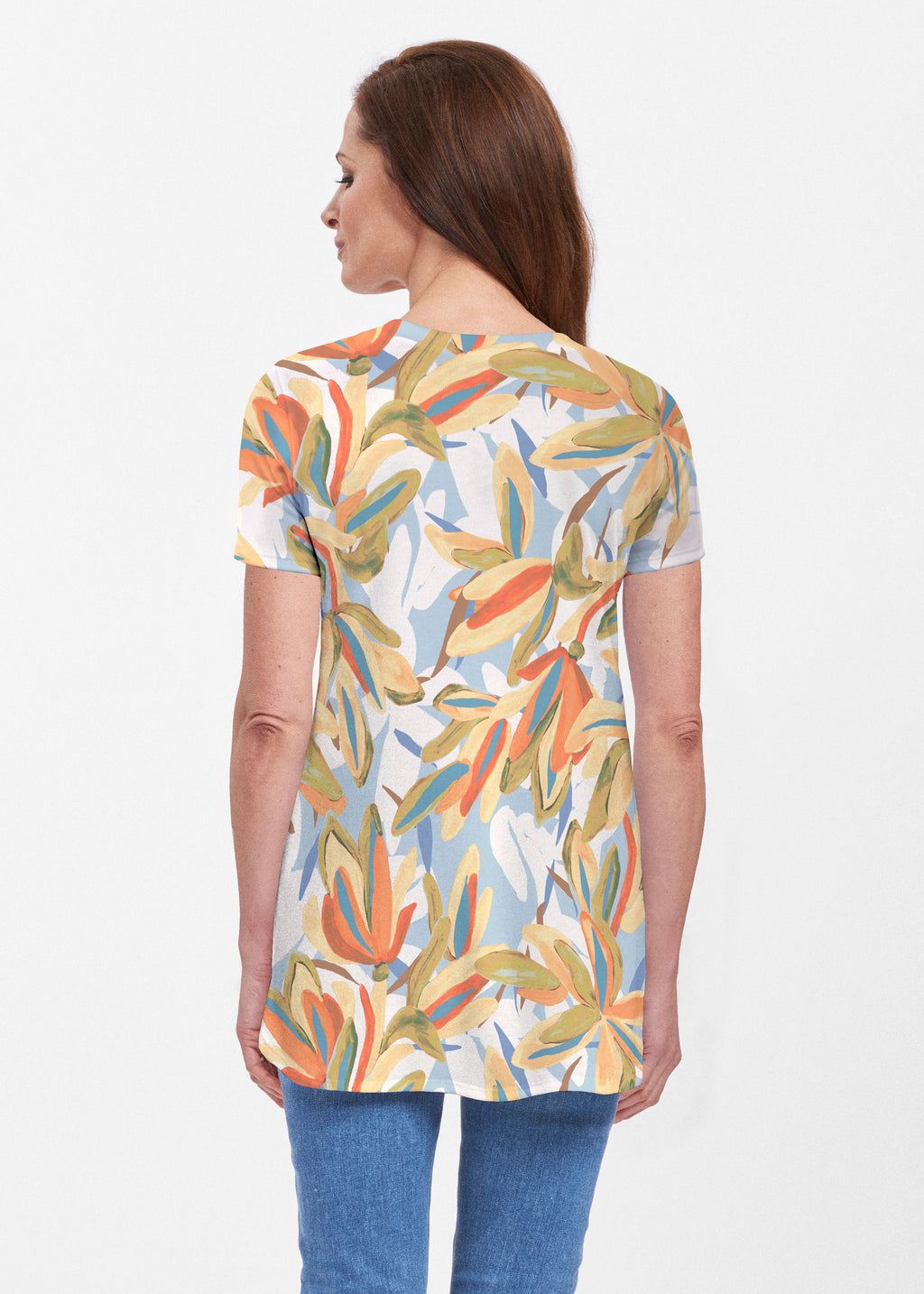 Our soft and feminine short sleeve silhouette tunic is sure to flatter any figure. Made in our Butterknit fabic that flows into a relaxed curved hem that is slightly longer in the back with subtle side slits.