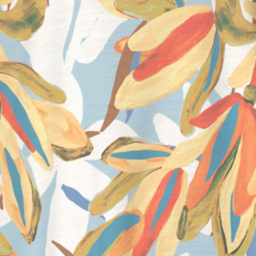 A stunning hand painted brushed floral print in yellow, orange, red, teal and blue designed by Susan Werner.