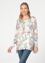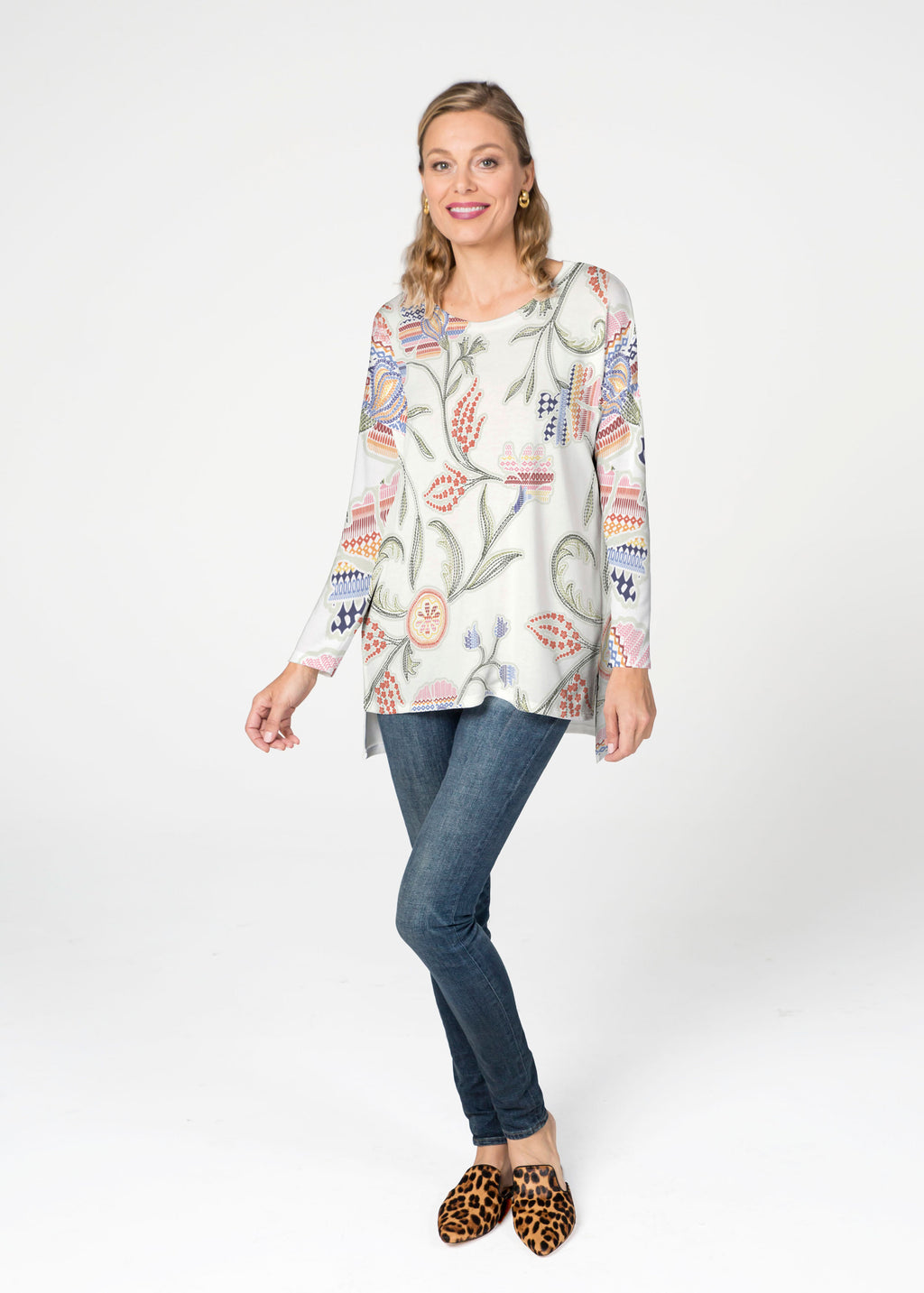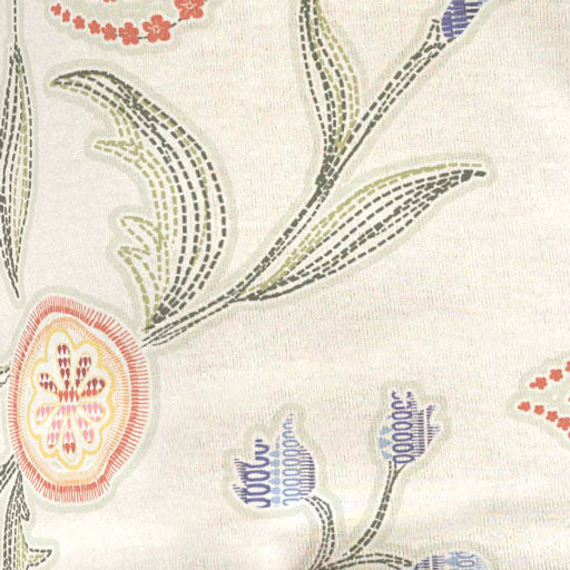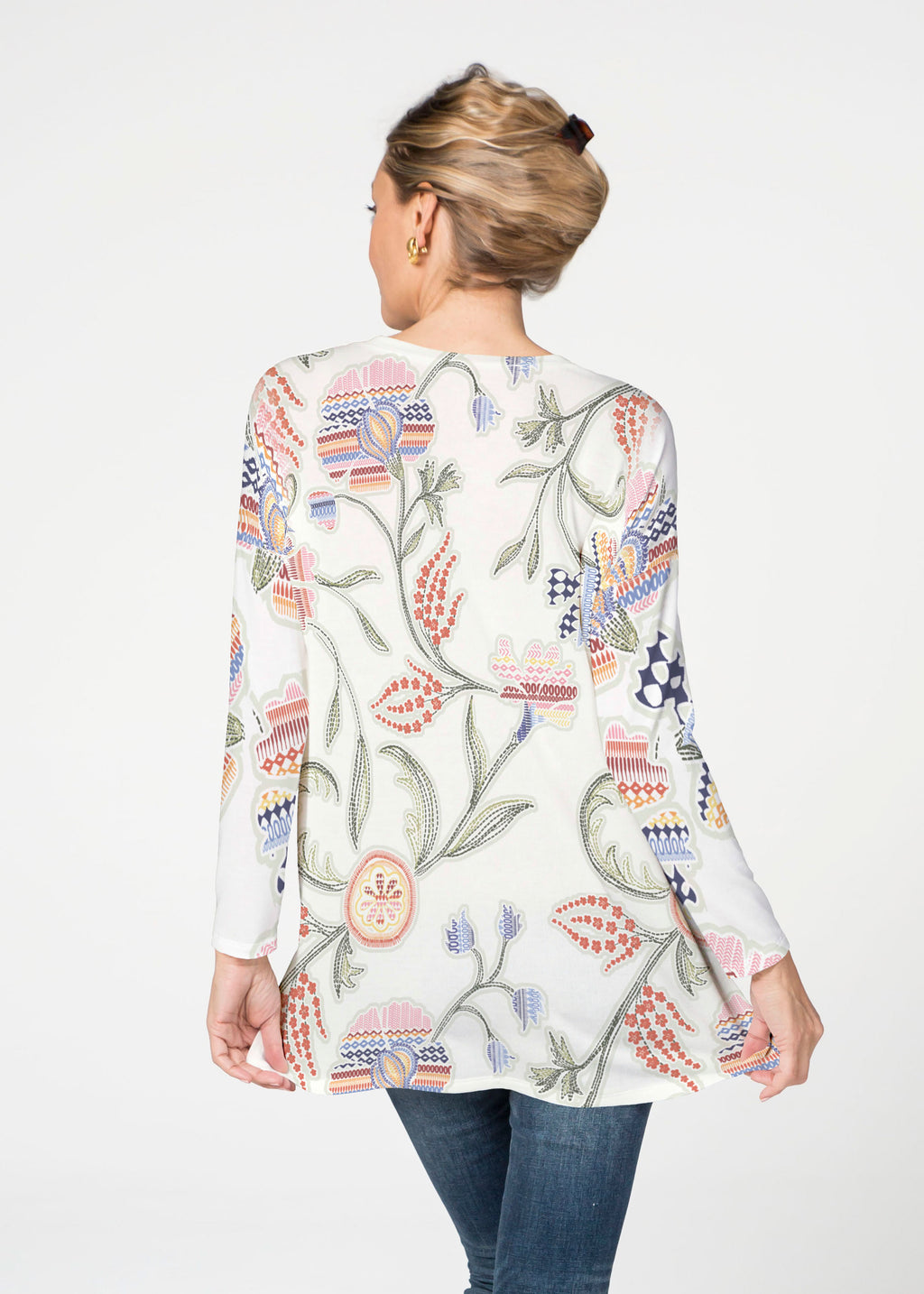 A playful print of stitched floral patterns on a white background and bold mixed sleeves. Designed by Susan Werner.