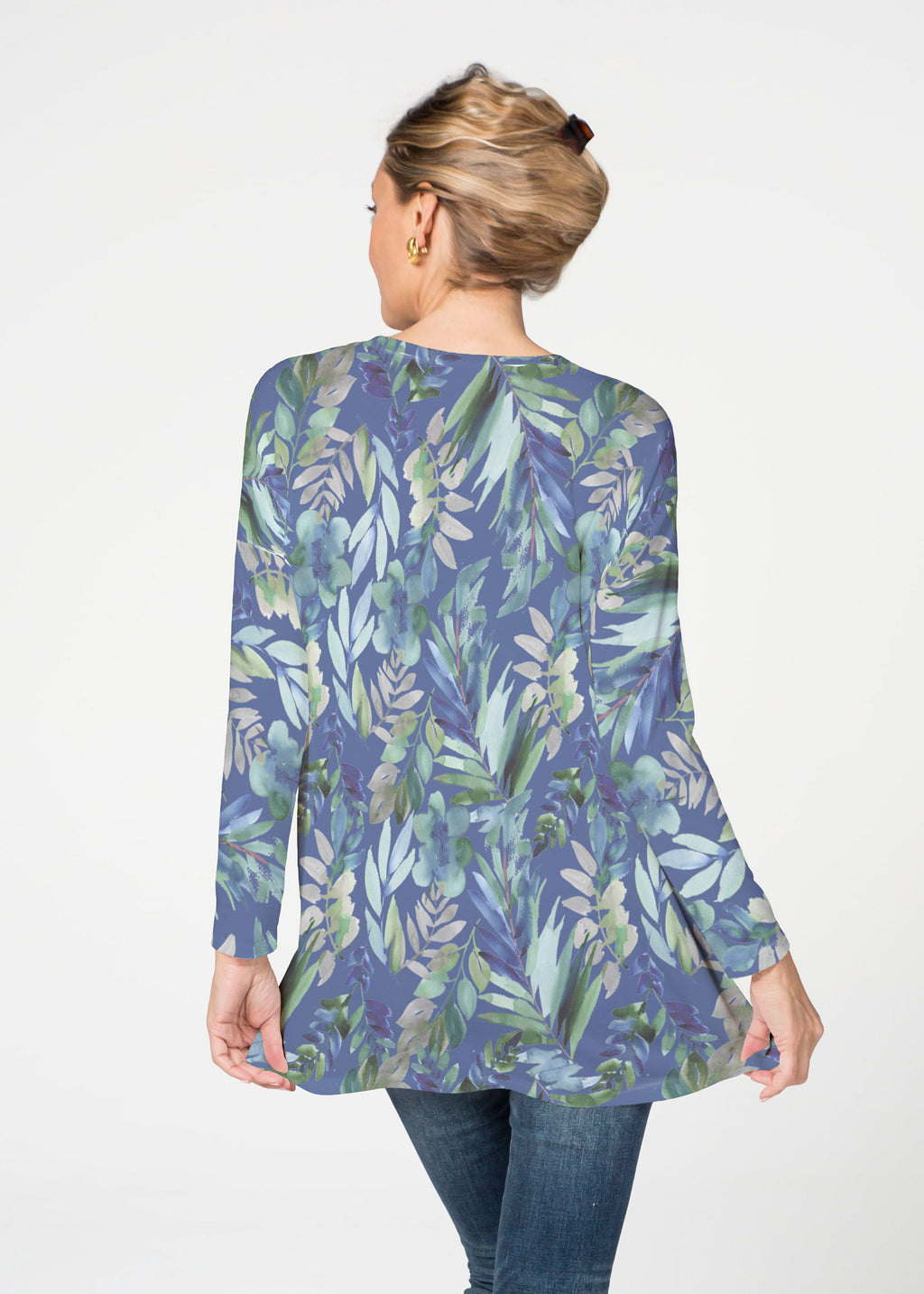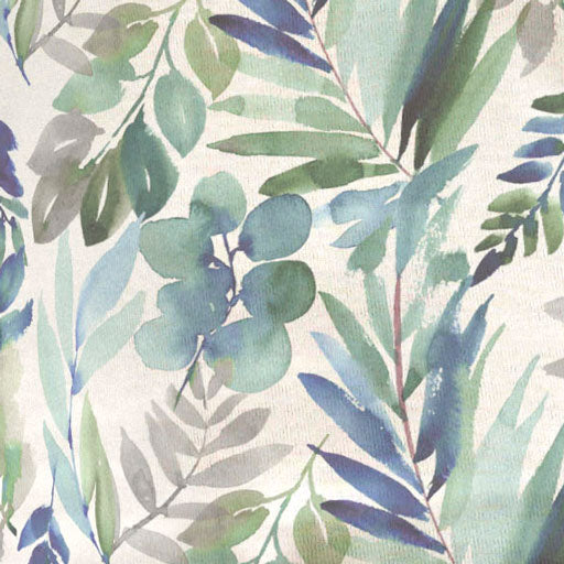 A pop of leafy sprigs in green and pale blues against a navy background with a flip of the print on back with a white background.