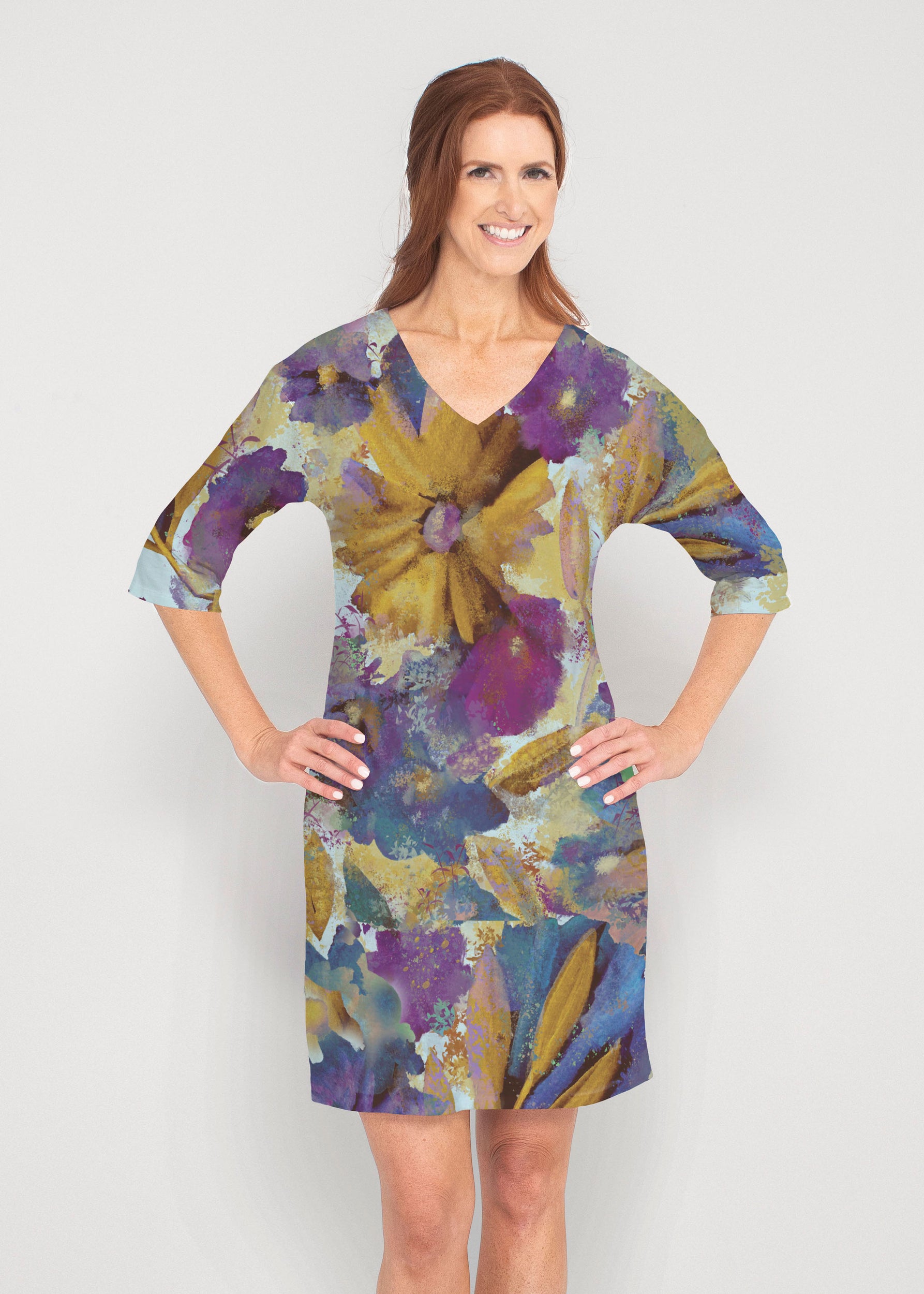 Be comfortable and fashionable all day in our soft Lucy fabric. This v-neck dress features loose 3/4 sleeves, drop shoulders and falls just at the knee.