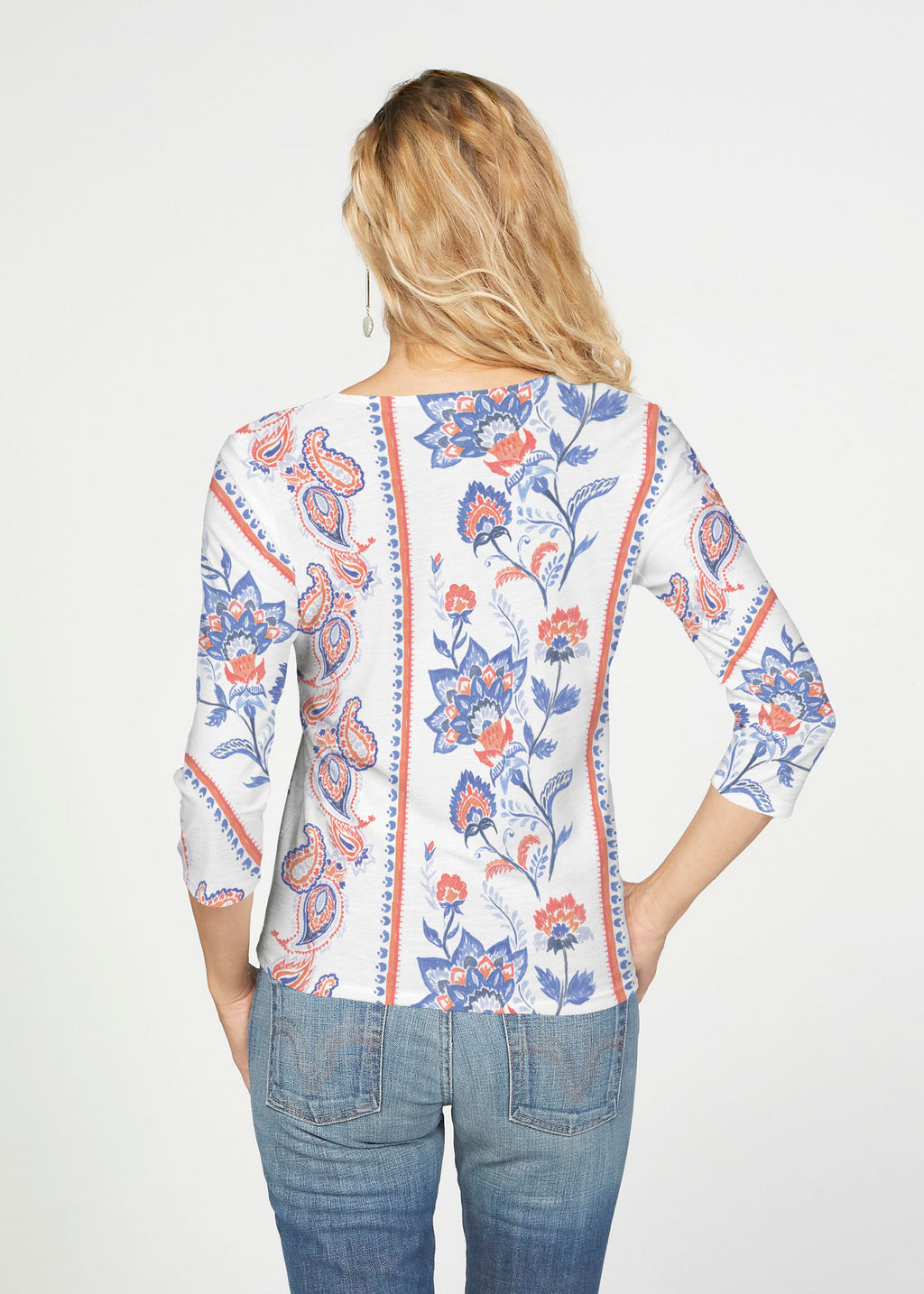 A vibrant hand painted floral and paisley print with stunning shades of blue, orange and white, designed by Susan Werner.