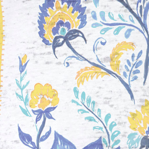 A vibrant hand painted floral and paisley print with stunning shades of blue, yellow and white, designed by Susan Werner.