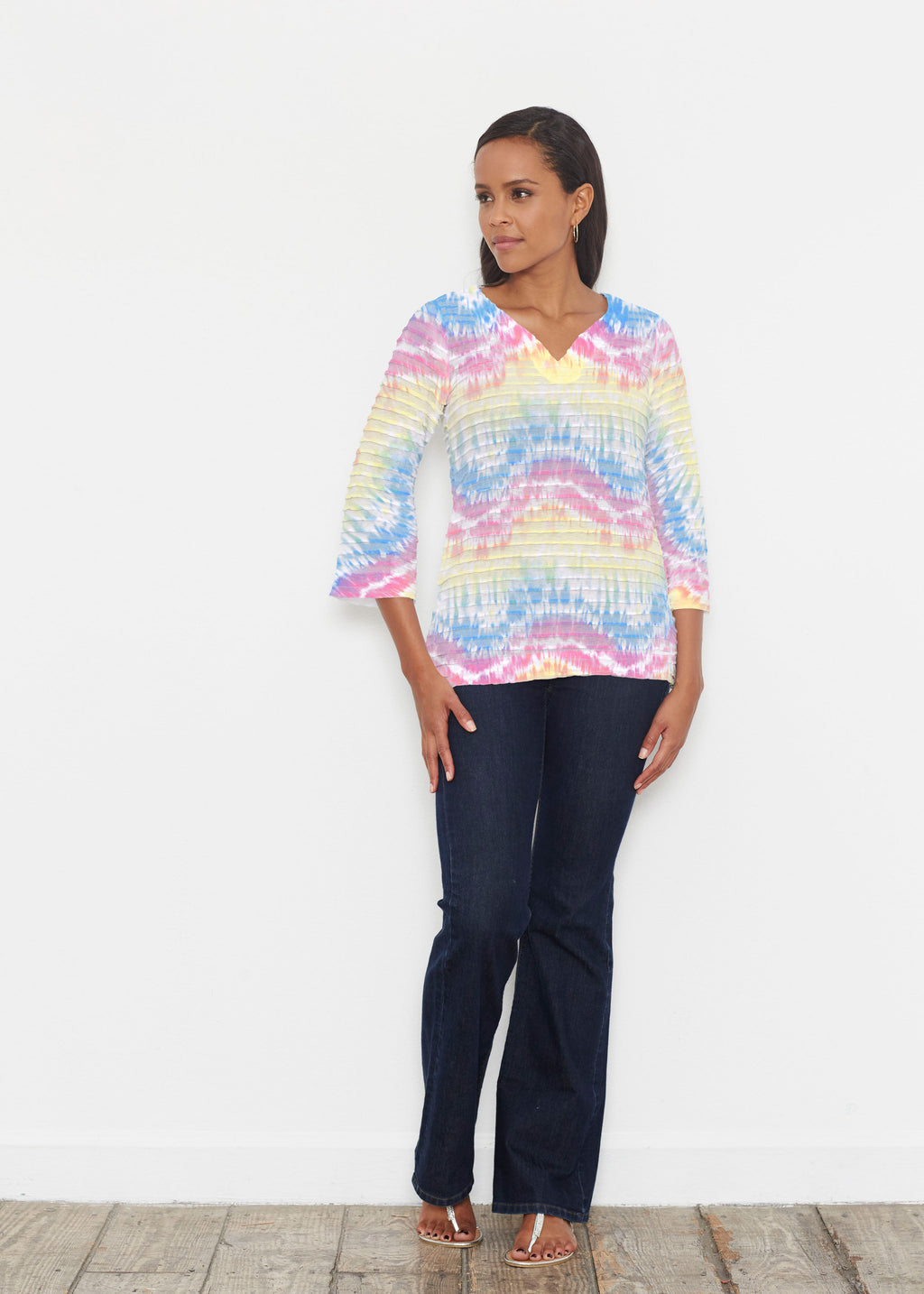 Waves Tie Dye (7896) ~ Banded 3/4 Bell-Sleeve V-Neck Tunic