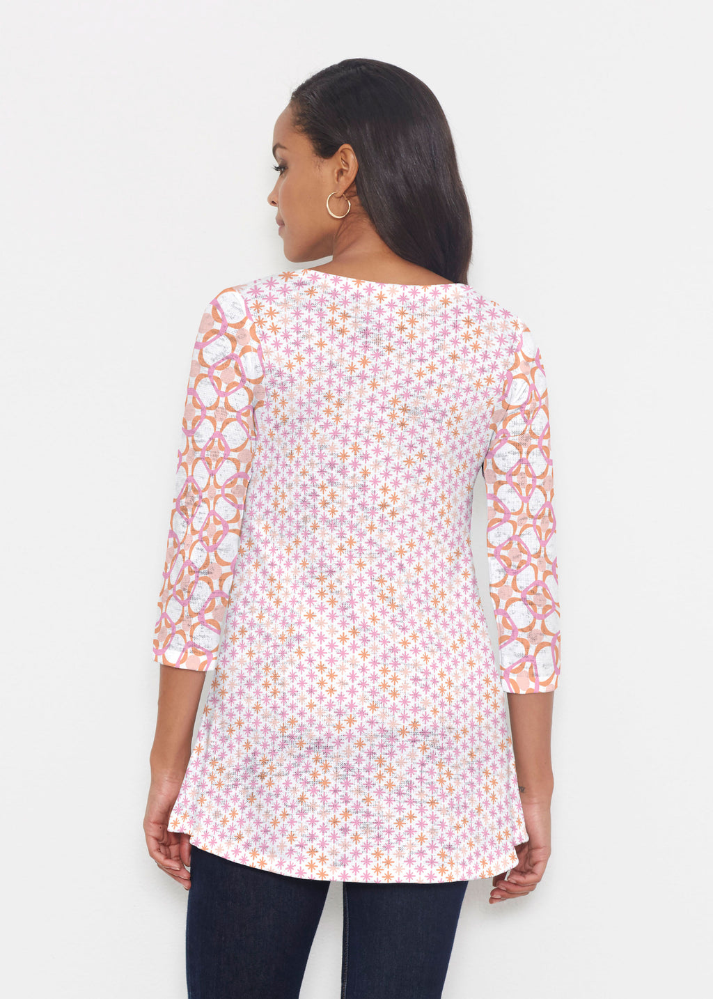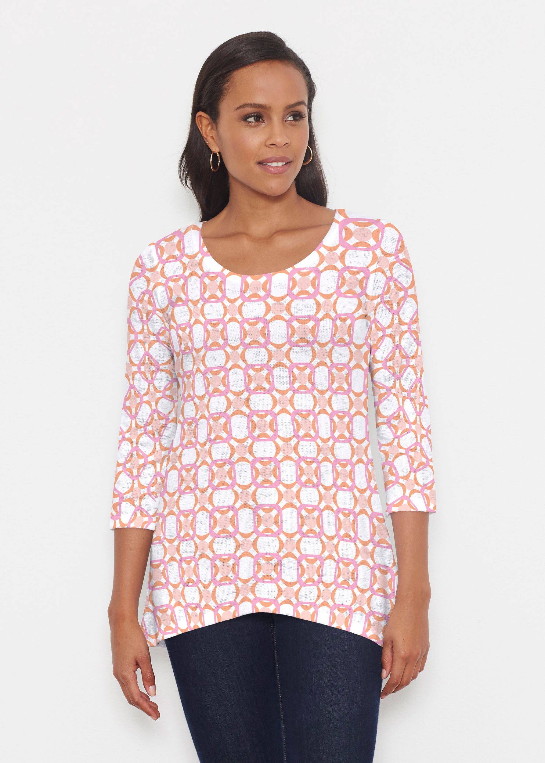 An elegant fit, the hemline falls higher in front then cascades beautifully down across back. Delicate scoop neckline and 3/4 sleeves made in our soft Baby Waffle burnout thermal blend.