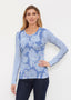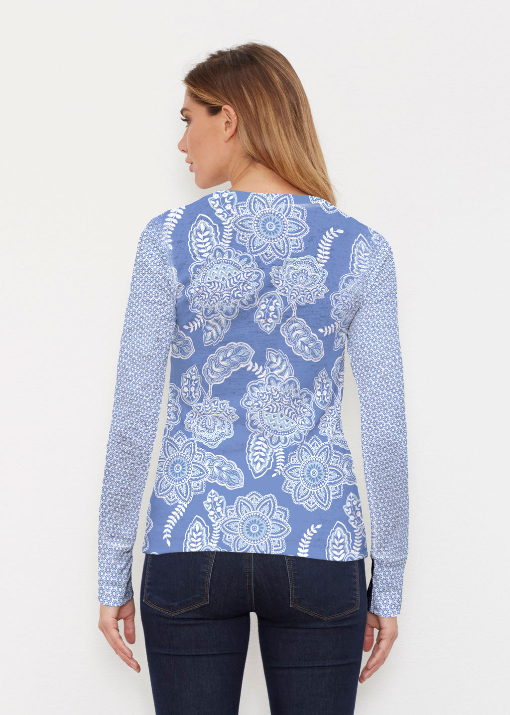 A beautiful print with blooming florals and detailed vines with contrasting print on the sleeves designed by Diane Kappa.
