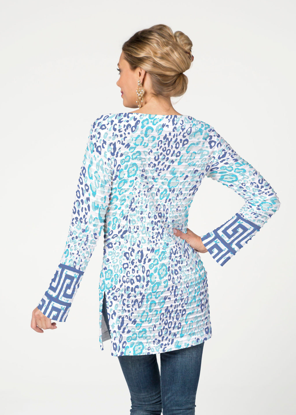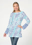 A mixed print with a Batik inspired Ikat pattern on the front and sleeves with an alluring abstract Zebra pattern on the back both of blue and navy. Designed by Susan Werner.