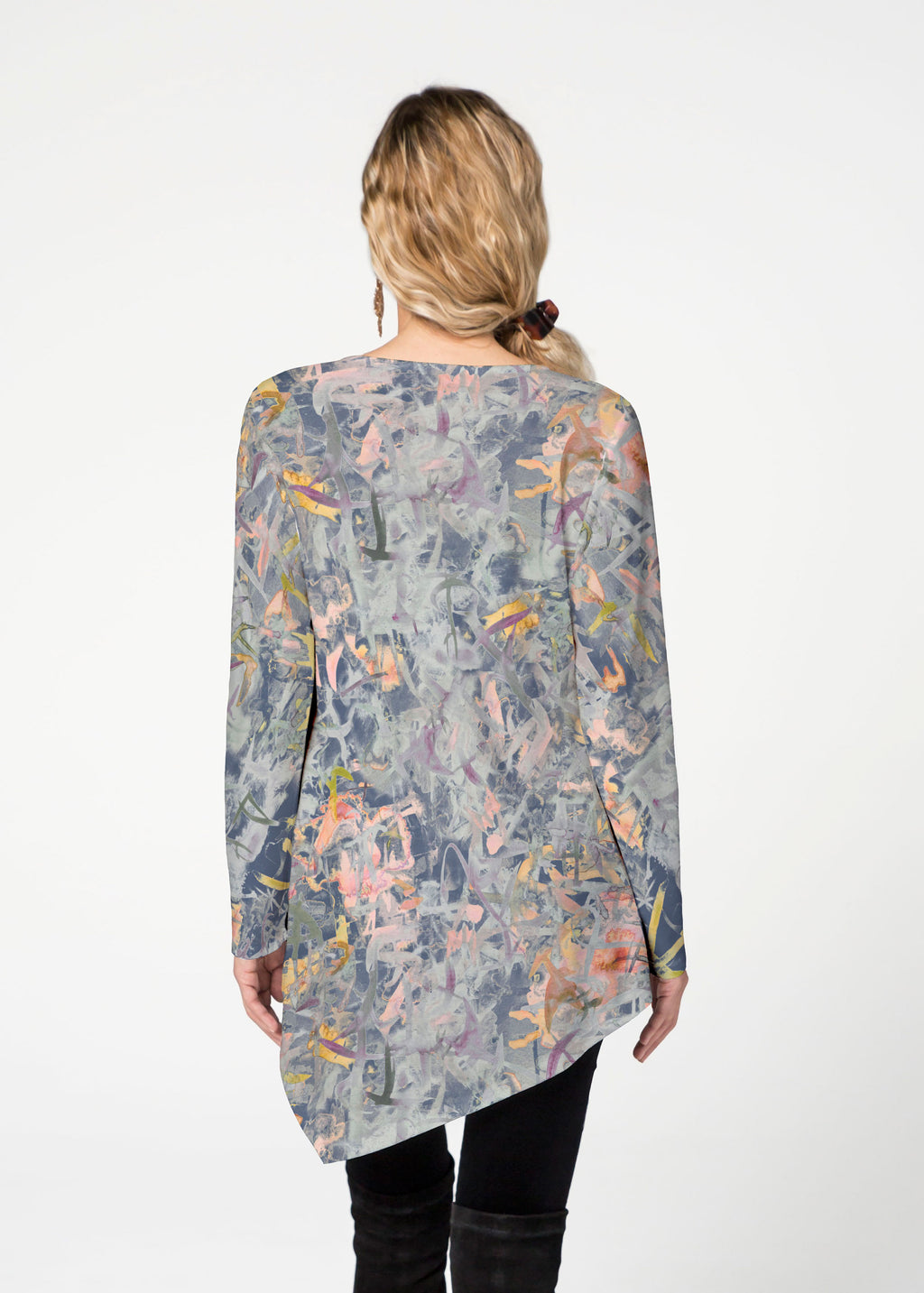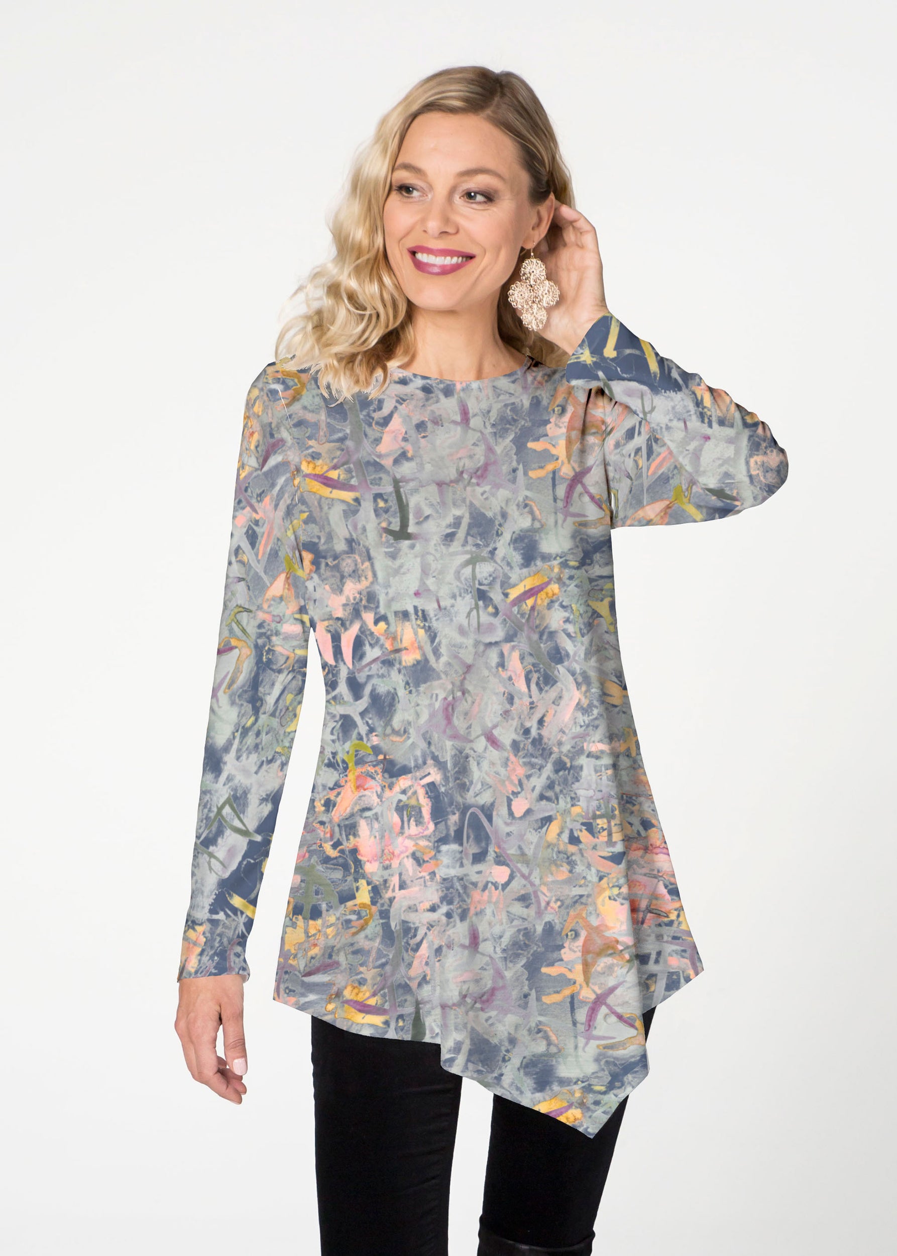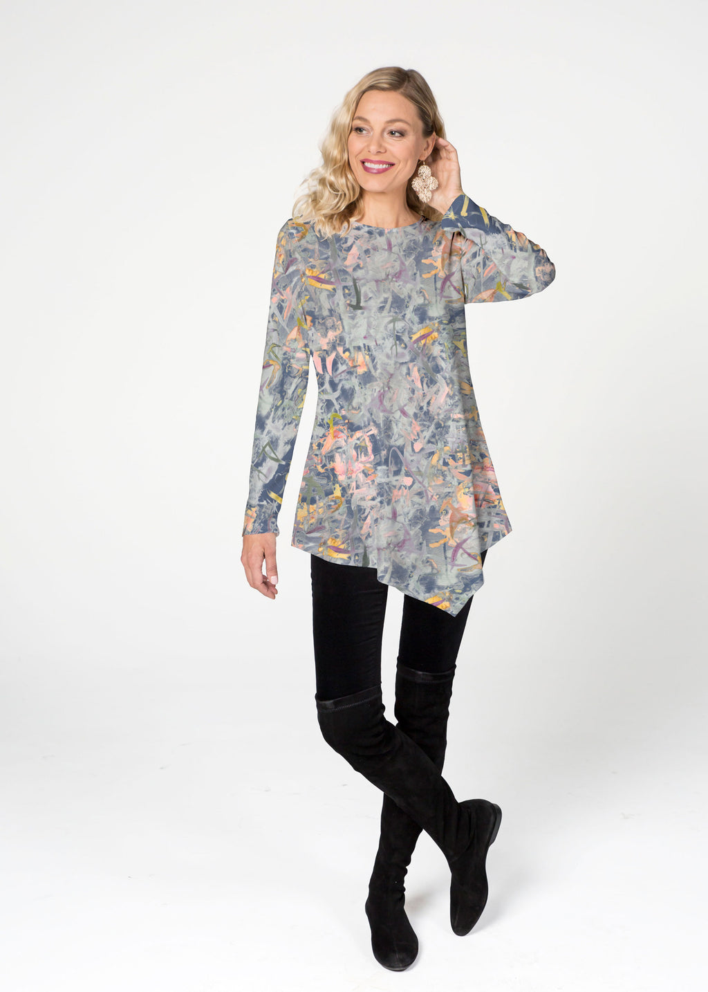 The Asymmetrical French Terry Tunic is soft and lightweight. This Relaxed crew neck features an Asymmetrical hem that falls just below the hip with long sleeves. Your one-of-a-kind garment is created using all-over soft garment sublimation printing. Selected designs are individually printed into your garment.