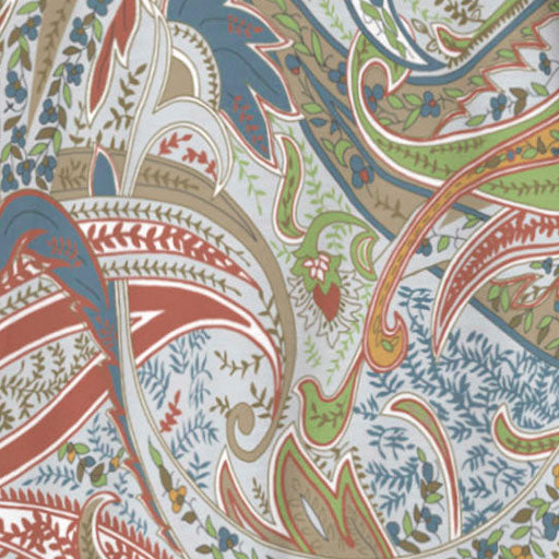 An elegant expression of bold paisley in rustic green, navy, rust, orange and grey.